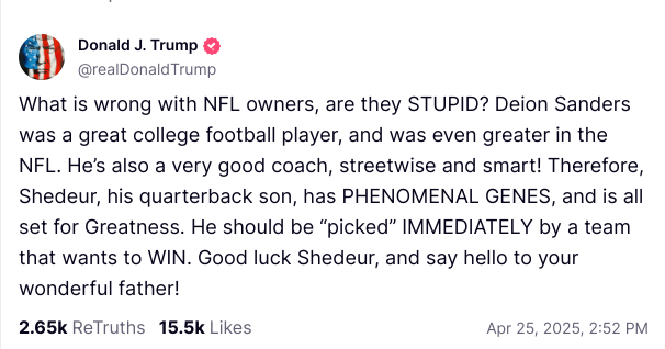“What is wrong with NFL owners, are they STUPID?” Trump wrote on April 25. “Deion Sanders was a great college football player, and was even greater in the NFL. He’s also a very good coach, streetwise and smart! Therefore, Shedeur, his quarterback son, has PHENOMENAL GENES, and is all set for Greatness.”