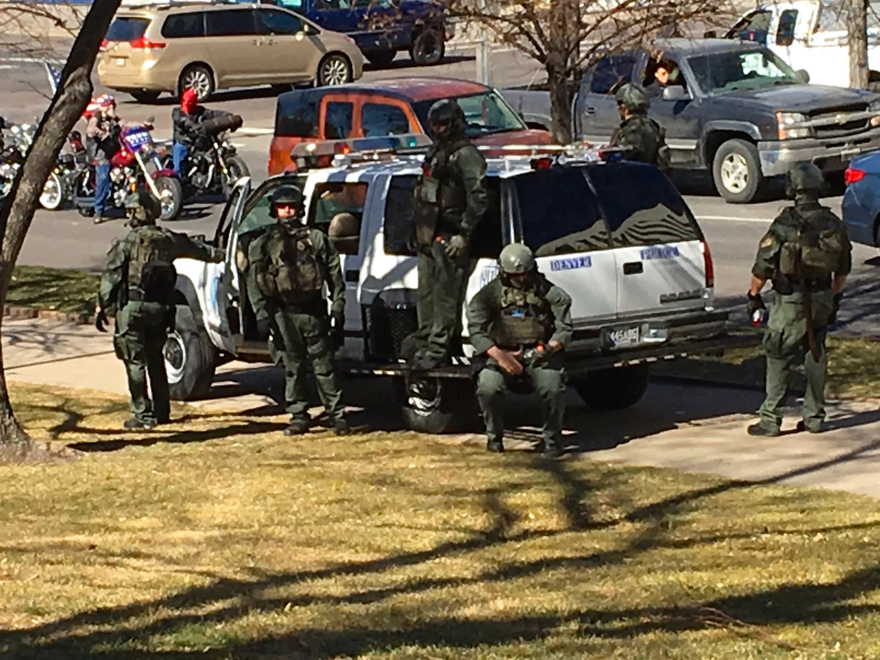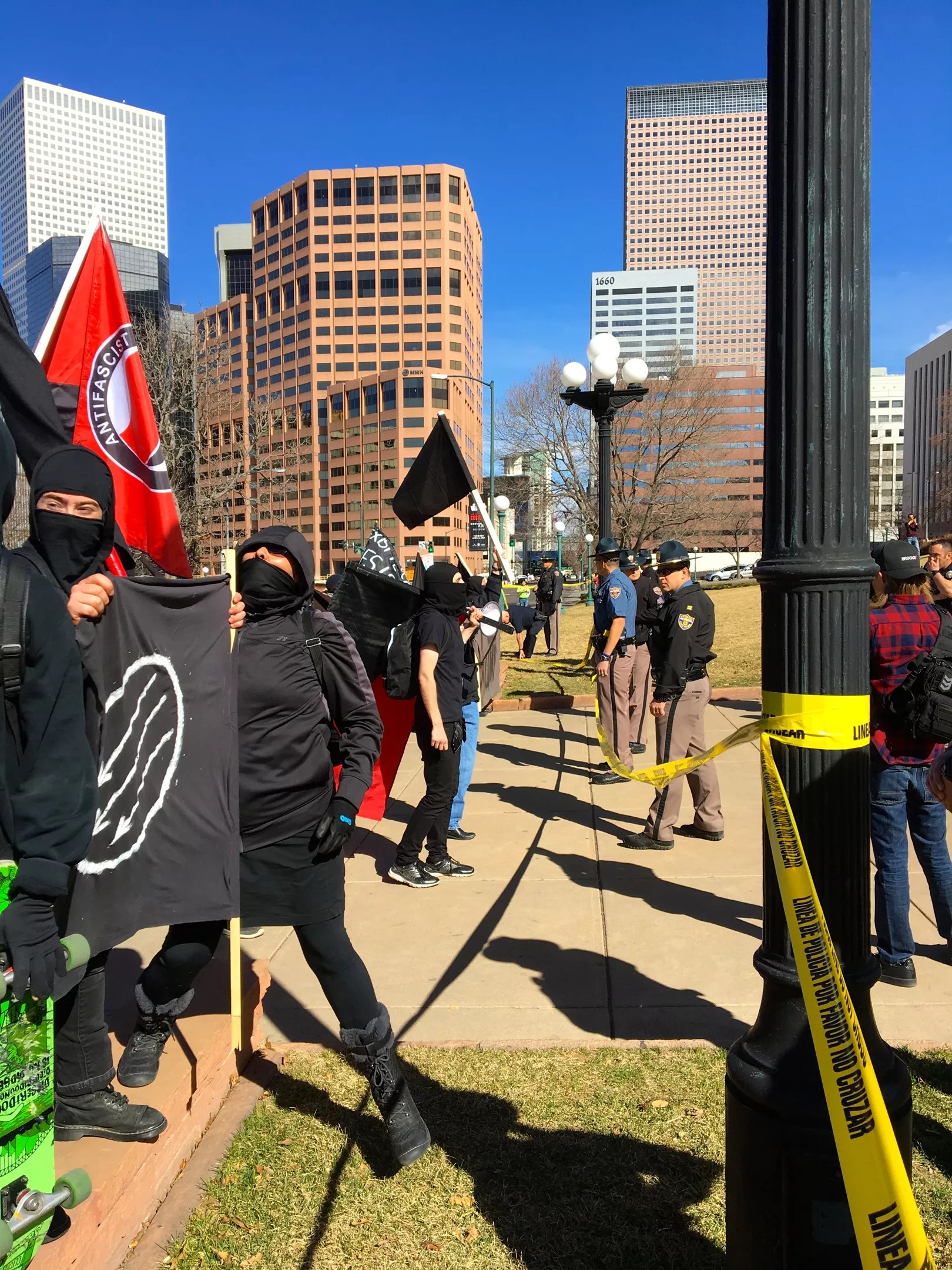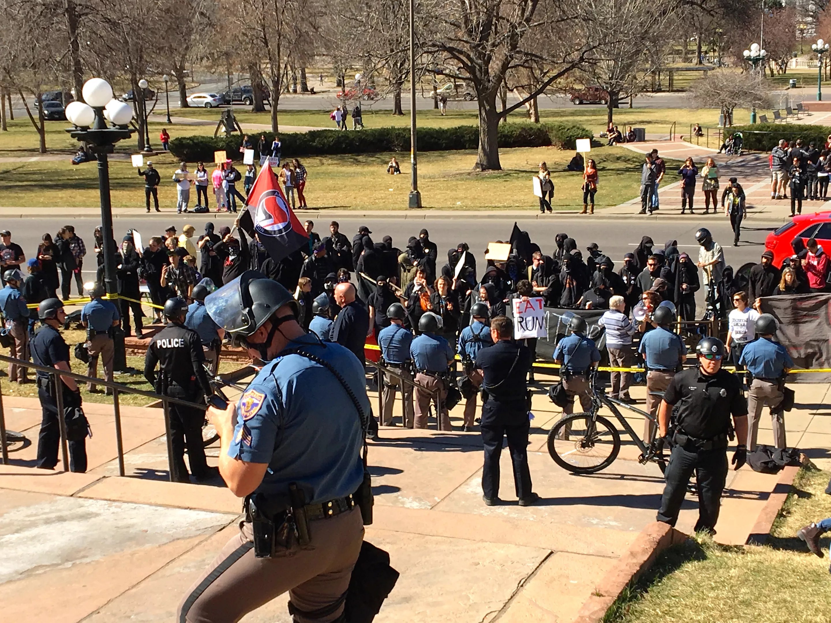 State Capitol police and Denver Police officers immediately formed a wall between the Trump rally and the approaching black bloc. As the rally continued, more and more officers would be called in to secure a perimeter around the Trump supporters. They included SWAT officers and riot police armed with specialized guns to disperse tear gas canisters. By noon, there was a one-to-one ratio of black-bloc protesters and law enforcement personnel.