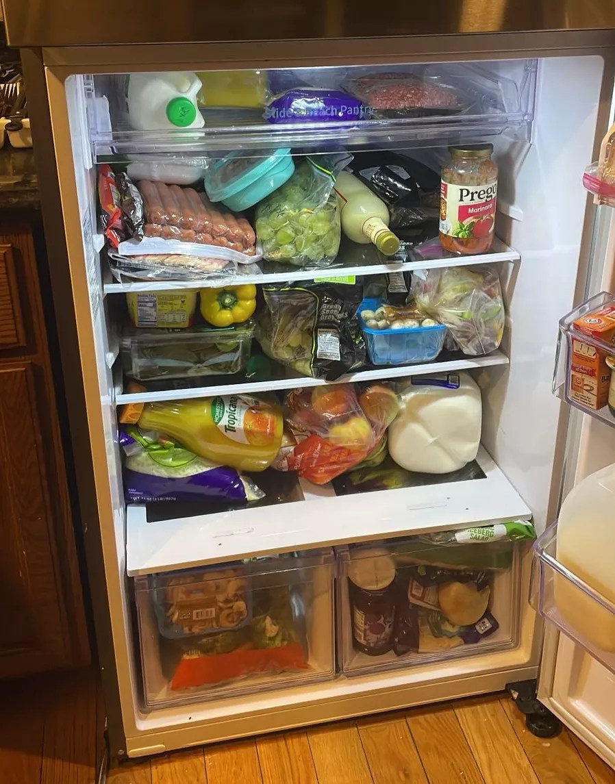 This is what a refrigerator looks like when fourteen people are crammed into one dwelling.