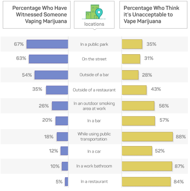 The survey found that people usually witness others vaping weed in expected areas, such as parks, on the street or outside of a bar or restaurant. But even while most people don’t care about vaping in public, over a third of the respondents said that doing so in those areas was unacceptable. Consumption settings with the highest rates of disapproval were inside a restaurant, in a bathroom at work or on public transportation.