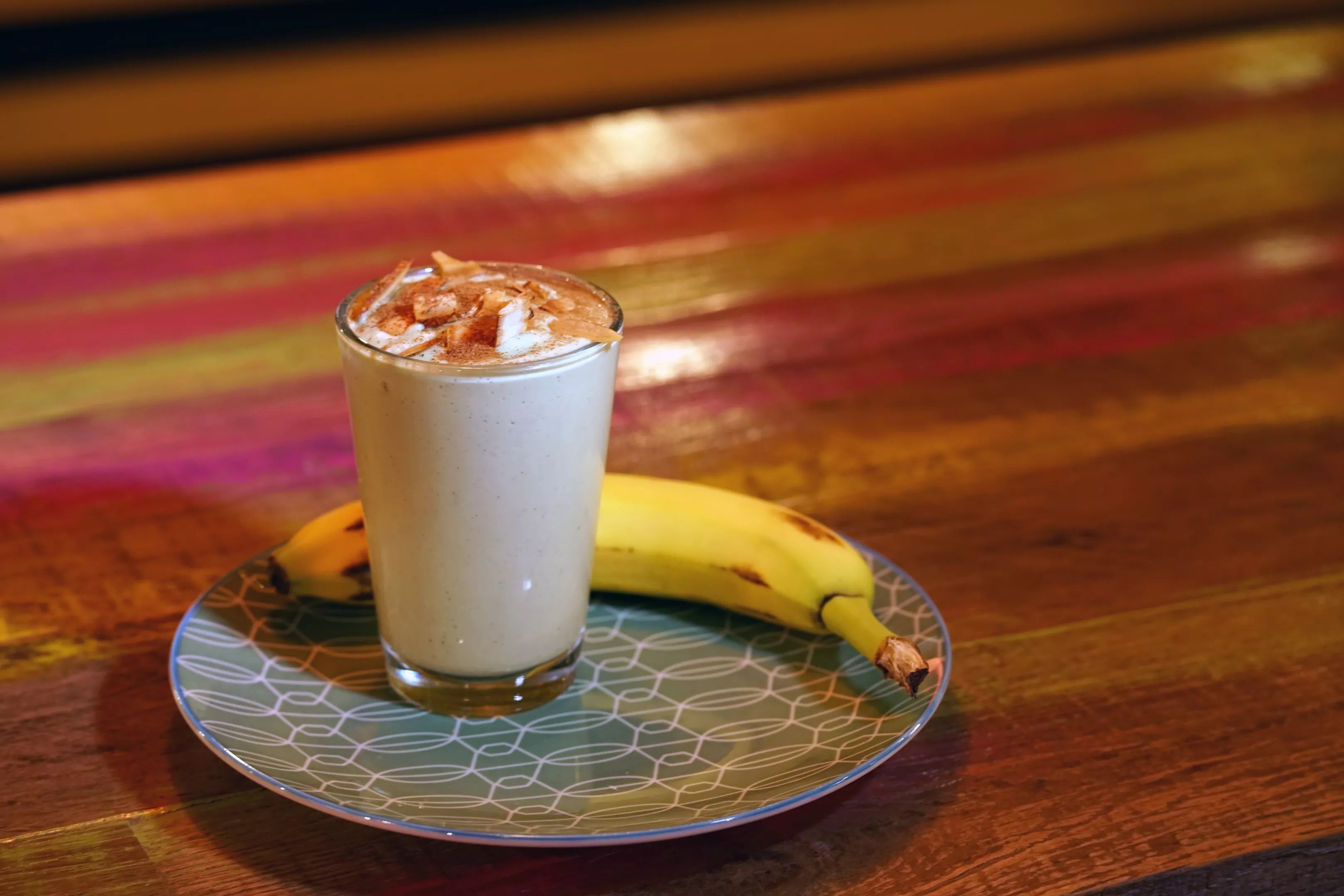 Add all ingredients to a blender and purée until smooth. Garnish with fresh coconut flakes and a dusting of cinnamon.
