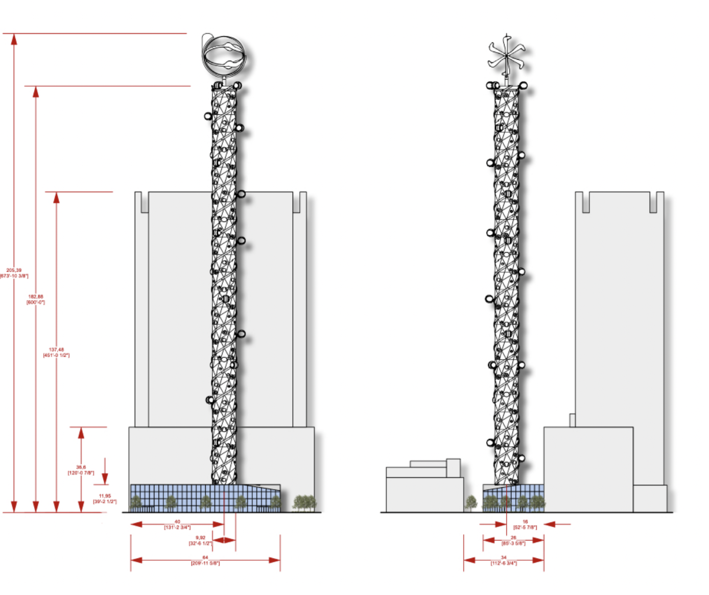 Details are sparse based on the initial filings, with the project description simply, “A 673′ tall observation ‘Spiral Tower’ feature. With new supporting structure/building on first floor.”