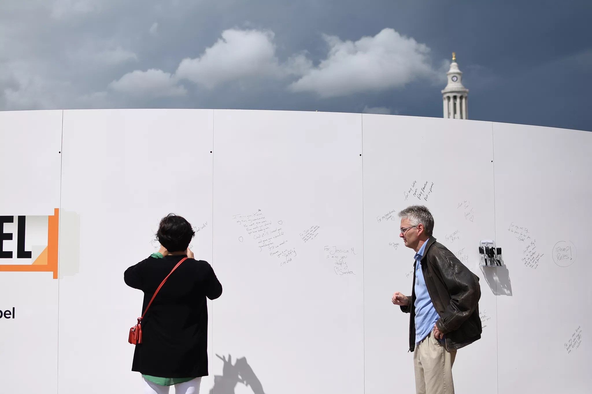 Dr. Varsha Lafargue, left, and Jeffery Kooistra sign the back side of the opioid memorial wall. Kooistra’s twin sister died of an opioid overdose.