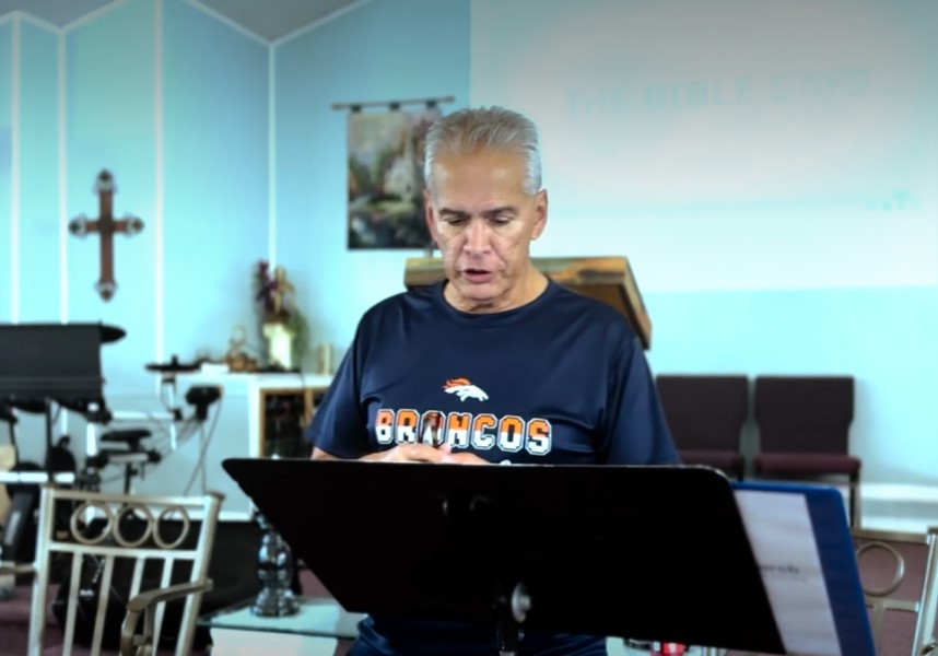 Pastor Mark Lopez, spreading the good word, and also Broncos fandom.
