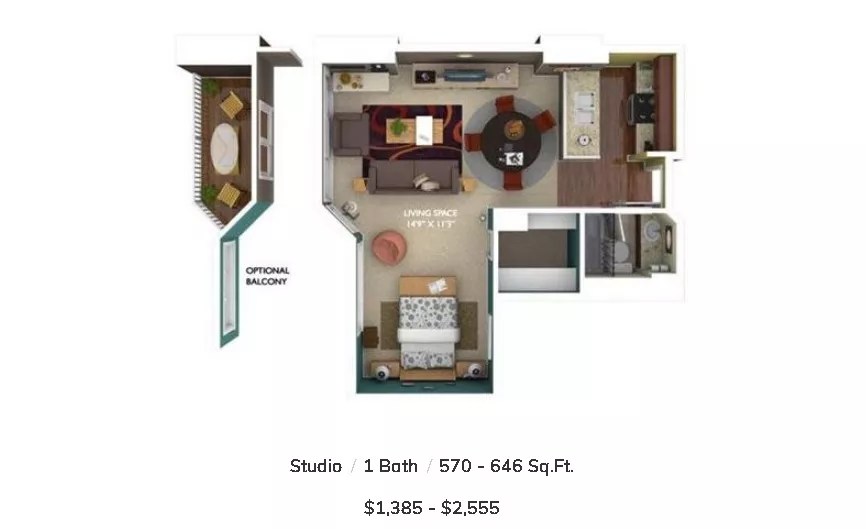 The floor plan of studio apartments available at The Seasons of Cherry Creek.