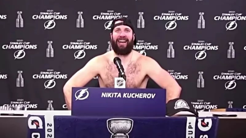 Nikita Kucherov was so happy about winning the Stanley Cup last year that he forgot his shirt.