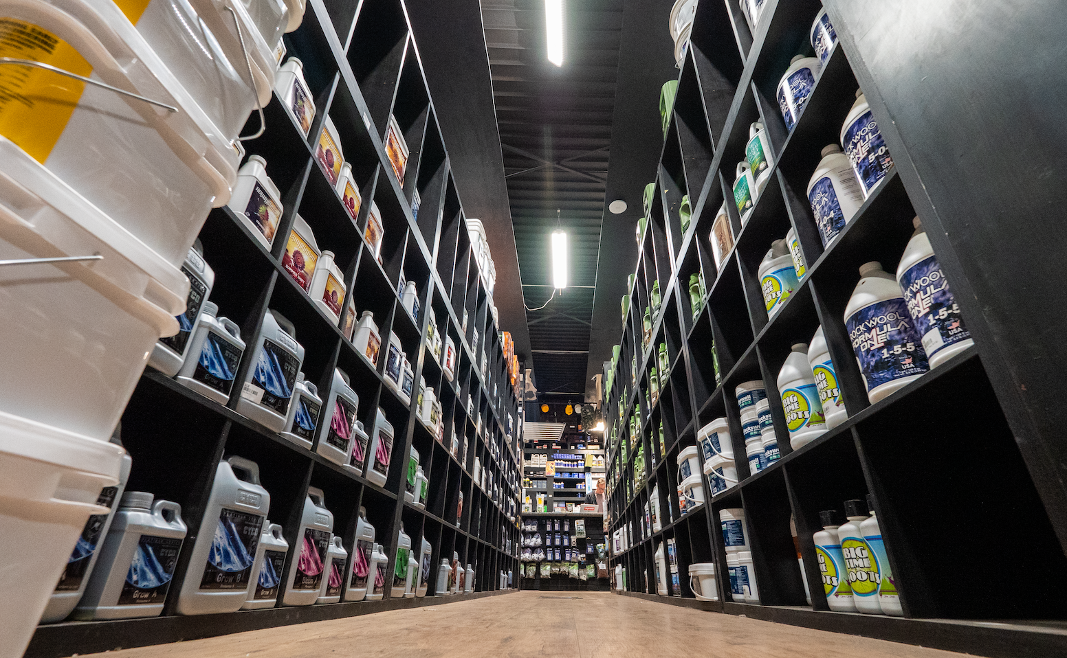 Inside the nutrient aisle at a GrowGeneration store.