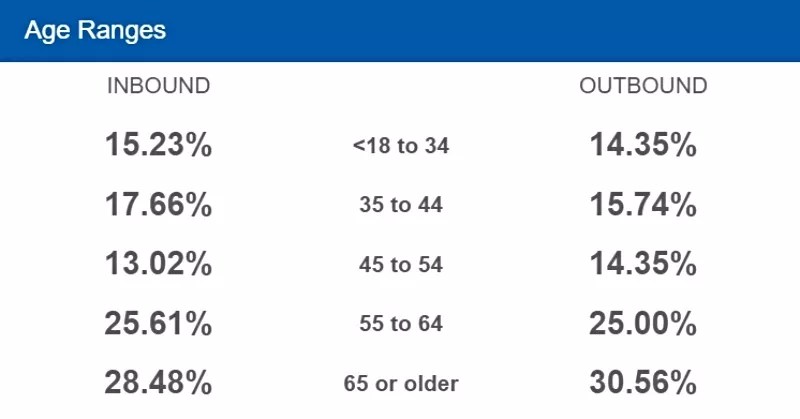 Over half of the transplants landing in Colorado were age 55 or older in 2021, according to United Van Lines data. These results underscore demographic evidence that the state’s population is growing older. For instance, U.S. Census Bureau numbers show that 39 of Colorado’s 64 counties had fewer people under age eighteen living there in 2020 than in 2010.