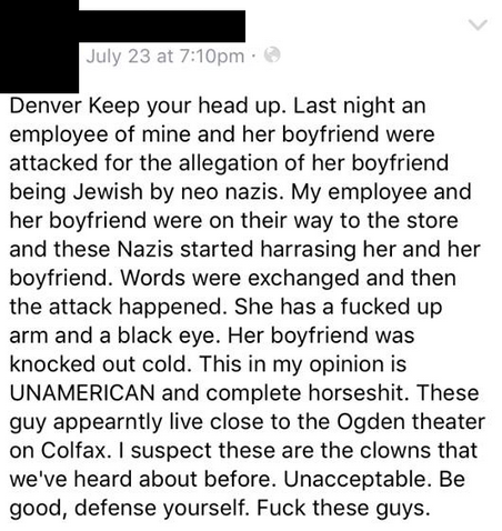 In its own blog post about this development, Denver’s branch of the Anti-Defamation League (which also took part in the aforementioned CBS4 package) provided more background on Planer’s California troubles – he faces an assault-with-a-deadly-weapon beef for a June 2016 clash in Sacramento – and his allegedly radical activities.