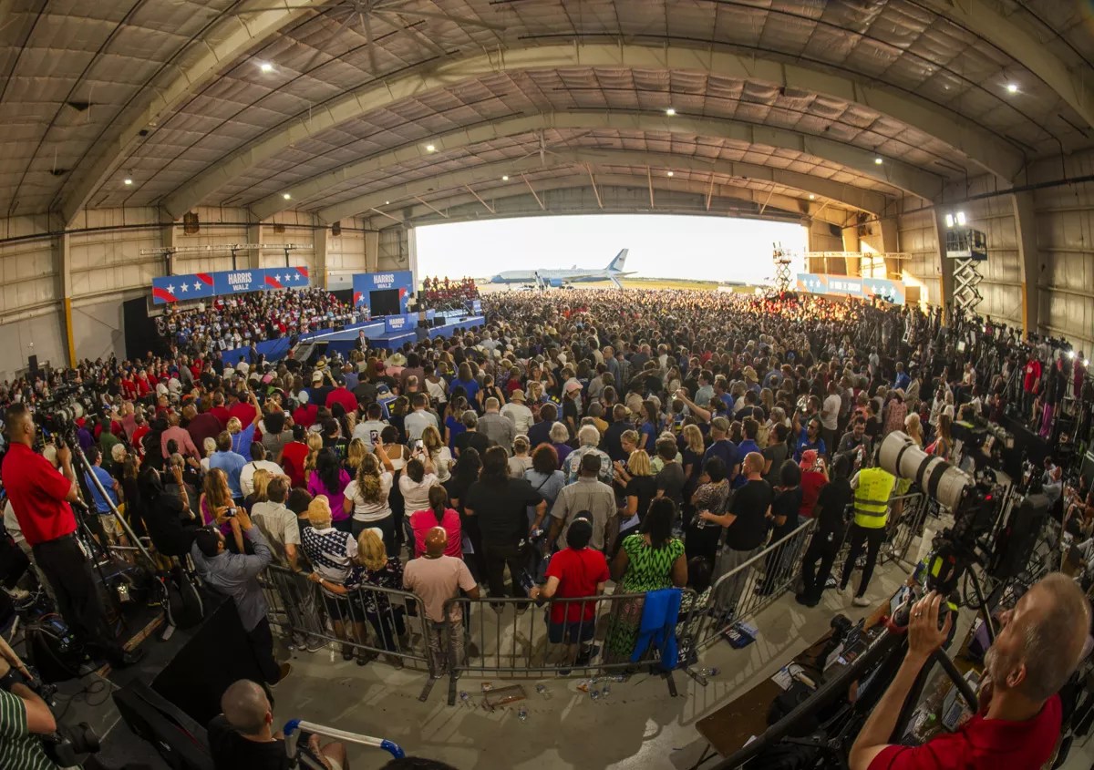 The crowd gathered in a hangar to listen to Kamala Harris.