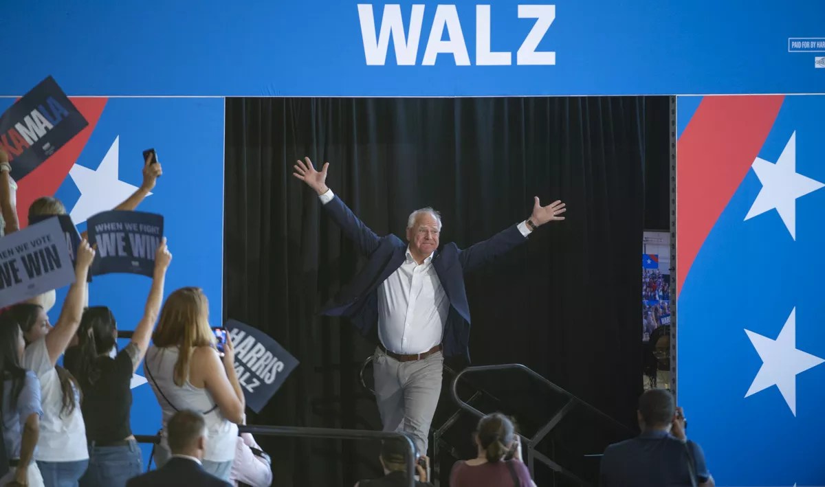 Tim Walz, the new vice-presidential candidate, greets the crowd.