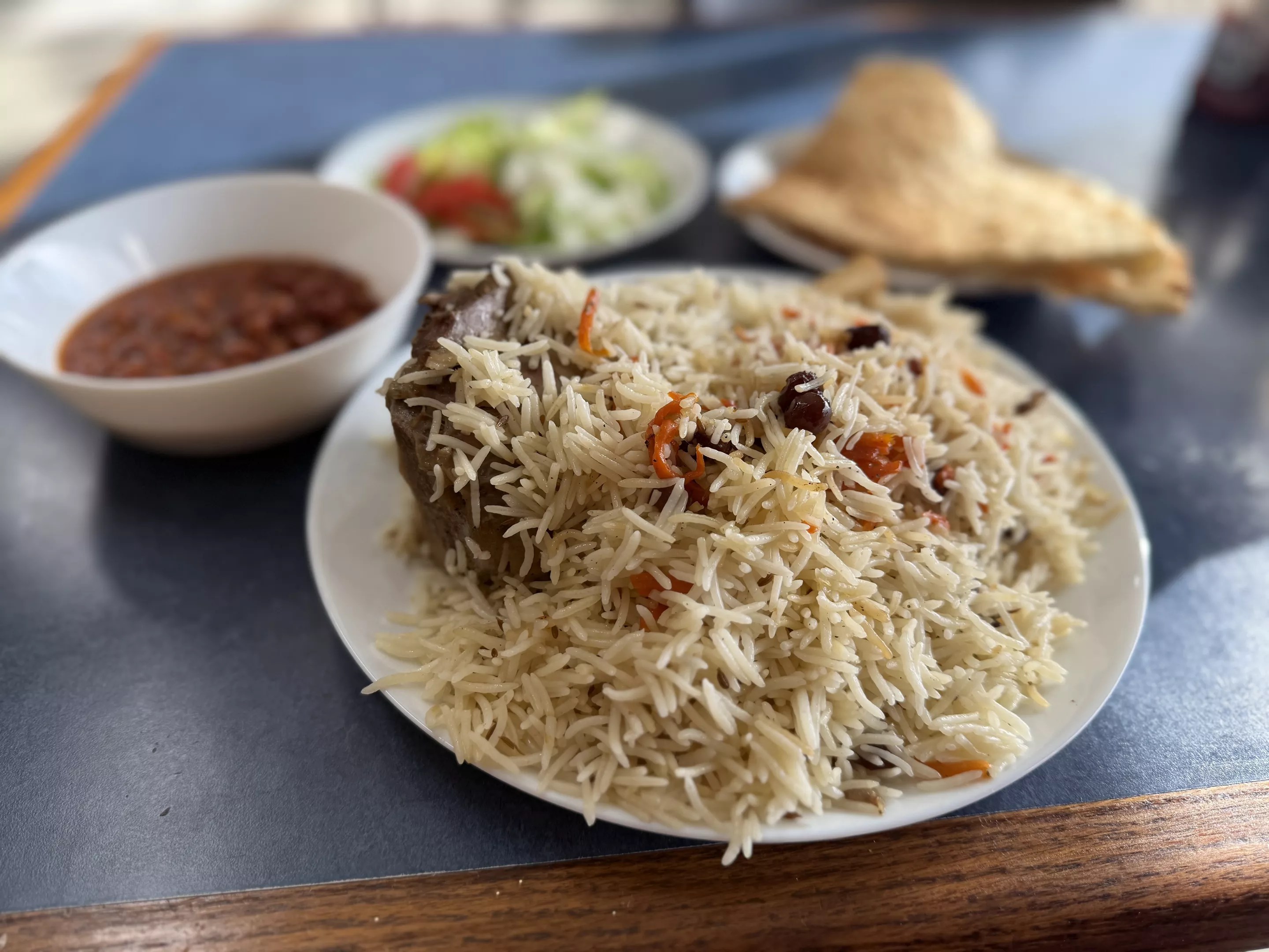 For the real Afghani deal, however, put aside the safety of the kebab and opt instead for the Qabili Uzbaki, a massive marinated and braised lamb shank covered with rice, caramelized carrots and raisins – pictures don’t do it justice, as the rice completely buries the meat.