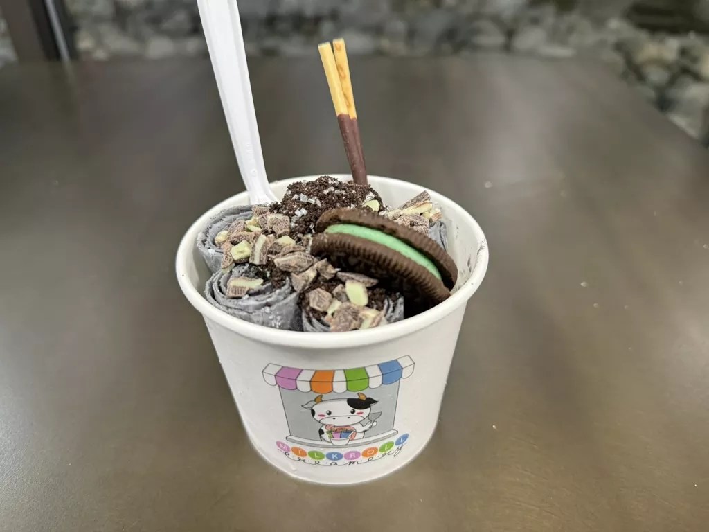 Milkroll specializes in Thai-style rolled ice cream, a trend born entirely from the social media era. It originated in the street markets of Thailand, where photos of the colorful bowls of delicately curled ice cream accompanied by a seemingly endless array of toppings and textures quickly went viral back in the 2000s, as did the equally compelling videos of the intricate process of making them.