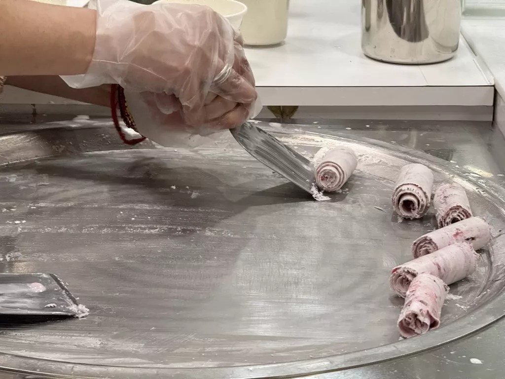 The show is watching the ice cream being made – a far more involved process than simply scooping frozen dairy into a cup. Rolled ice cream is very much a hands-on affair. Actually, make that two hands.