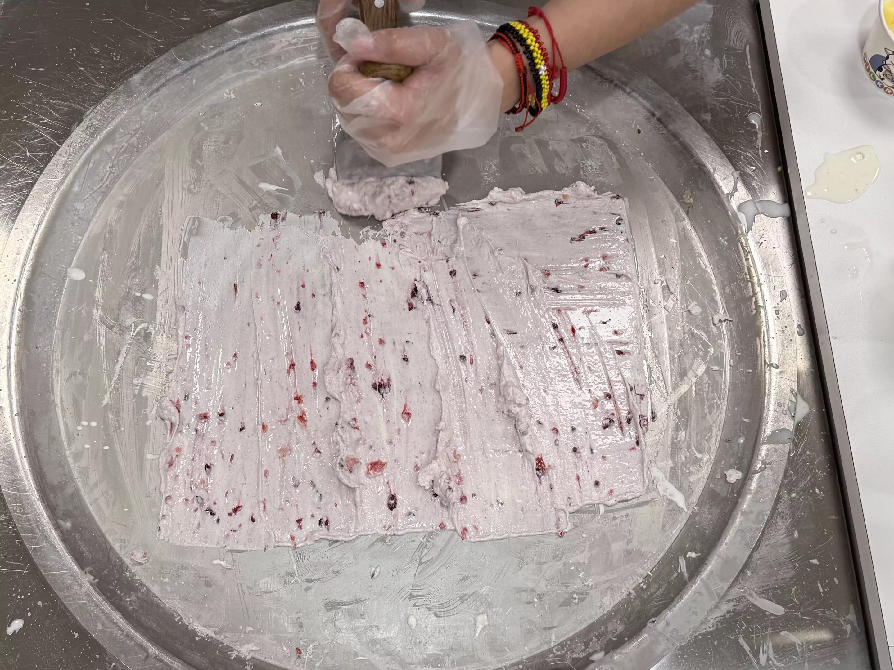 A loose ice cream base is poured onto a frozen round metal plate. Then, a staffer takes two putty knife-shaped spatulas and cuts in whatever fillings and flavors the customer chooses, creating a sort of paste as the base begins to solidify from the cold.