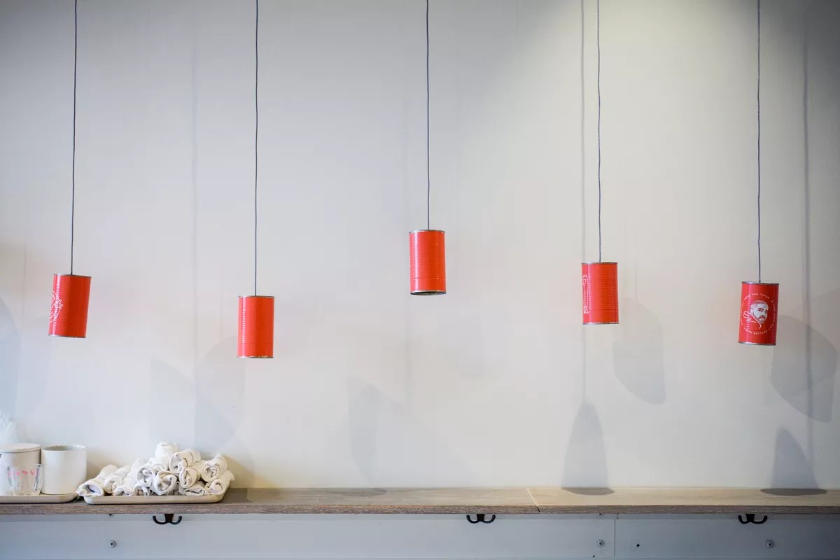 Fish toast isn’t standard cafe fare, even for a cafe with this much flair and attitude (and, in fact, Call’s fancy toasts are actually called “tartines”). The walls are white, with just a few orange accents, and squeezing into one of the six tables squashed together along them requires that the people next to you stop their conversation and lean out of the way. (But at least there are tables; when Call opened last December, it only had roll-out stadium seating.) If the vibe is Scandinavian, the accents are all-American, and slightly juvenile at that. Orange cans hang from the ceiling above a narrow counter, replicas of the tin-can phones that kids once used to “talk” to their friends next door. The business card features a banana, a nod to the whimsical banana phone. And a neon sign in the bathroom, hung over wallpaper that looks like pages from a phone book, glows suggestively: “For a good time.”