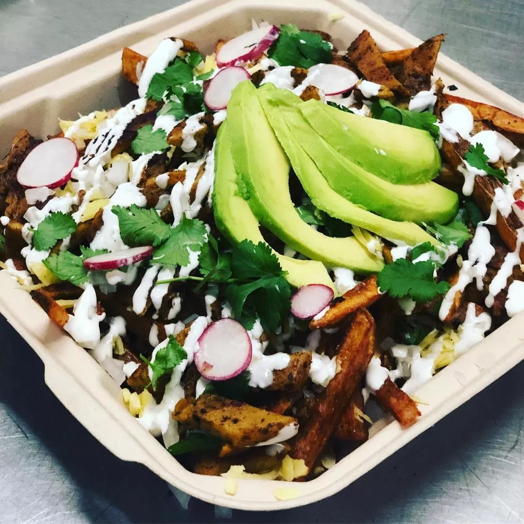 Alires was inspired to re-create the same flavors he knew and loved, only veganized to fit his new lifestyle. He marinates thin-sliced seitan to make a popular carne asada, selling the product to local food trucks. Recently, he teamed up with Vegan Van for Choloass…ada Fries: fresh-cut fries topped with the seitan carne asada, vegan queso, sour cream, onions, cilantro, radish and avocado, and served with salsa roja.