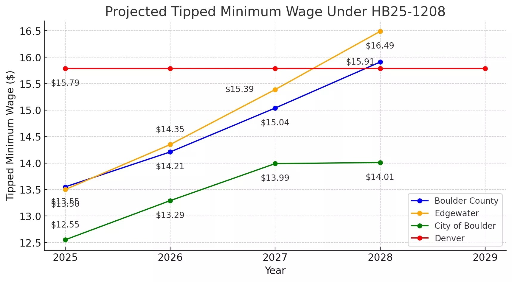 During that time, both sides of the argument came together and struck a compromise that completely upended the bill’s original proposal. Instead of adjusting Colorado’s tip credit or setting ceilings and floors for the state, the sponsors removed the majority of the existing language of the bill and instead called for allowing local governments to determine their own tip offsets, with a minimum of $3.02 (which is what the current tip offset is statewide).