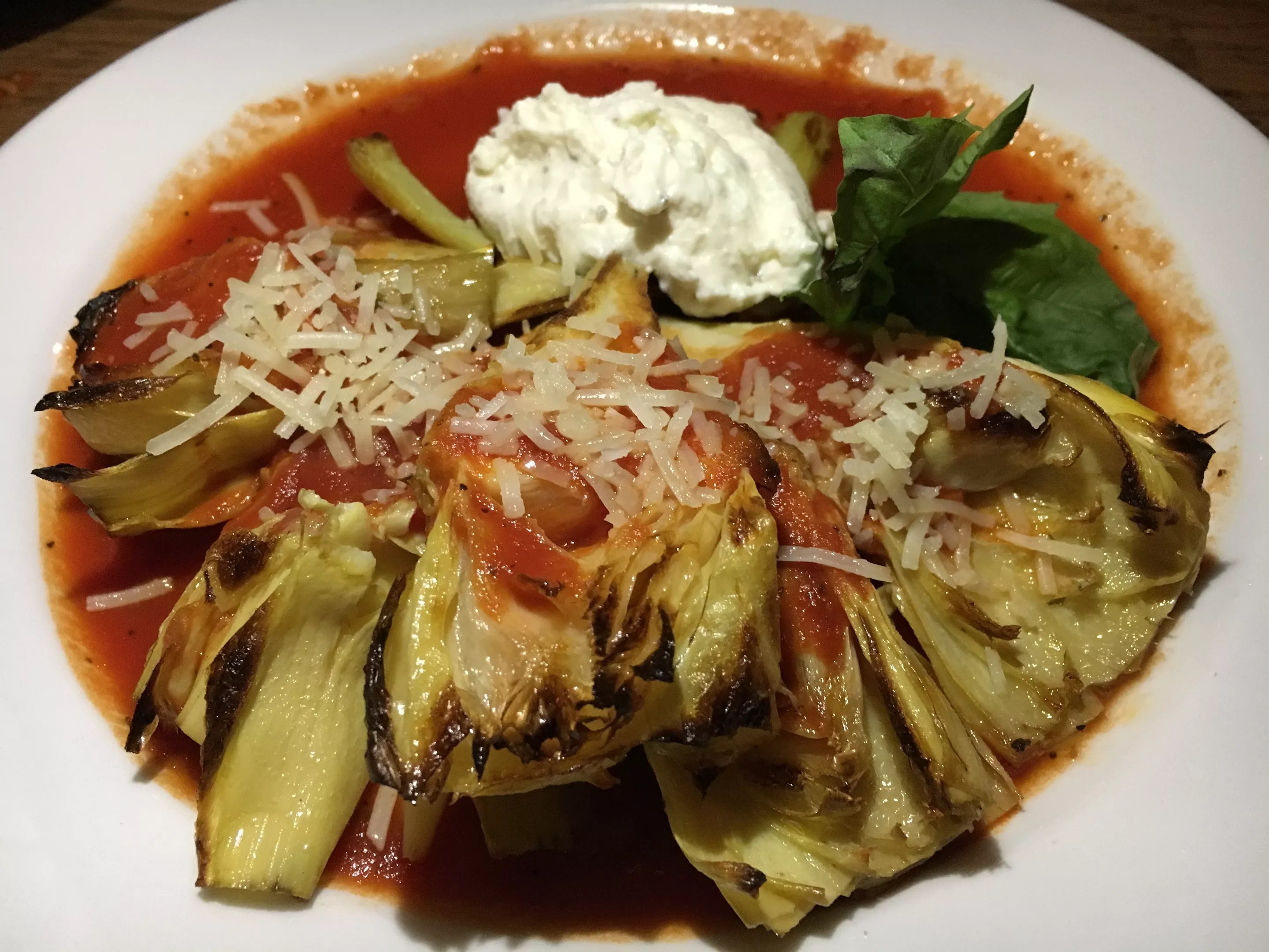 Thankfully for the technologically challenged, the restaurant keeps the menu simple, with only a handful of toppings available for pizzas (which come in one size), several baked appetizers, some entree-sized salads – like a generous kale Caesar – and a few other appetizers. There’s only one meat topping (pepperoni), and most of the appetizers are simply variations on ingredients used in several different ways. You can get a plate of roasted artichoke hearts, for example, topped with red sauce, Parmesan, ricotta and fresh basil, or you can get most of those ingredients on your pizza. Hefty four-ounce meatballs and oven-roasted chicken wings in a spicy-sweet sauce can be had for those in need of more meat, or you can get a plate of pepperoni chips, which are nothing more than pepperoni fried to a crisp and served in a pile – a plain but surprisingly effective appetizer best shared with several people.