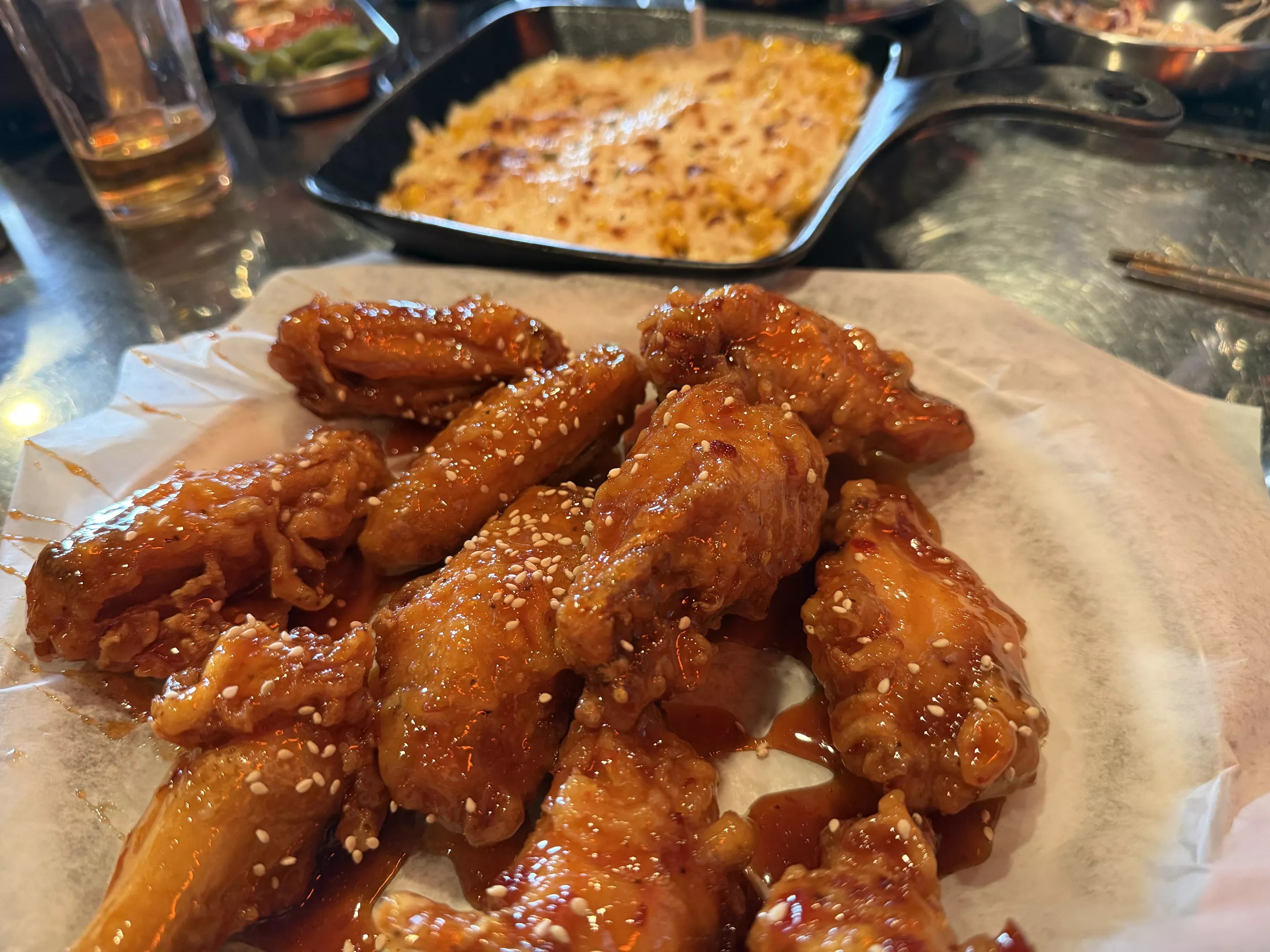 Fried chicken wings with a sweet spicy sauce, and corn cheese.