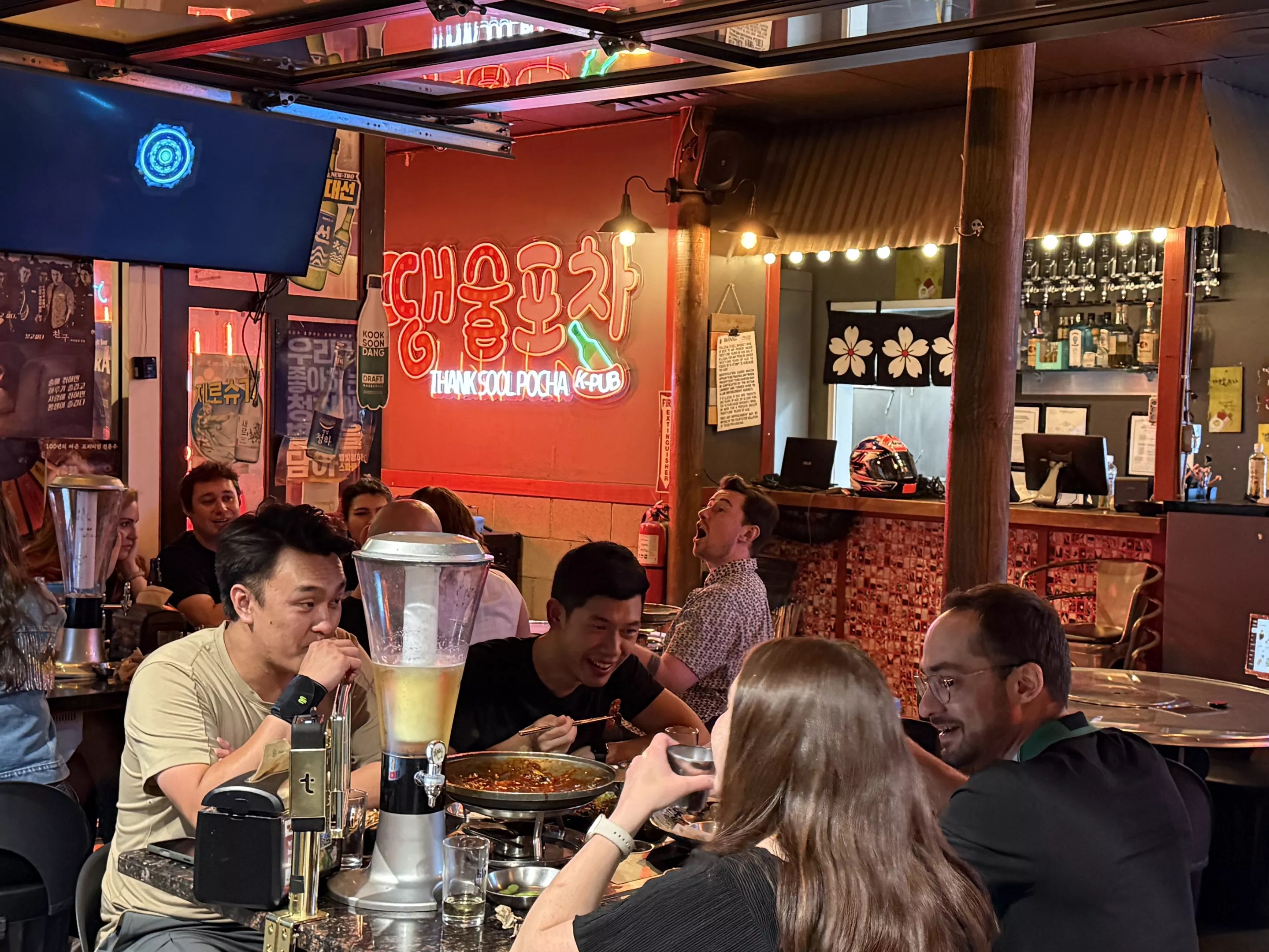 It all makes for a fun night out, from as early as 4:00 p.m. to as late as 2:00 a.m. Diners range from families with kids grilling skewers together, to groups of twentysomethings milling around a large table, to selfie-taking K-pop wannabes.