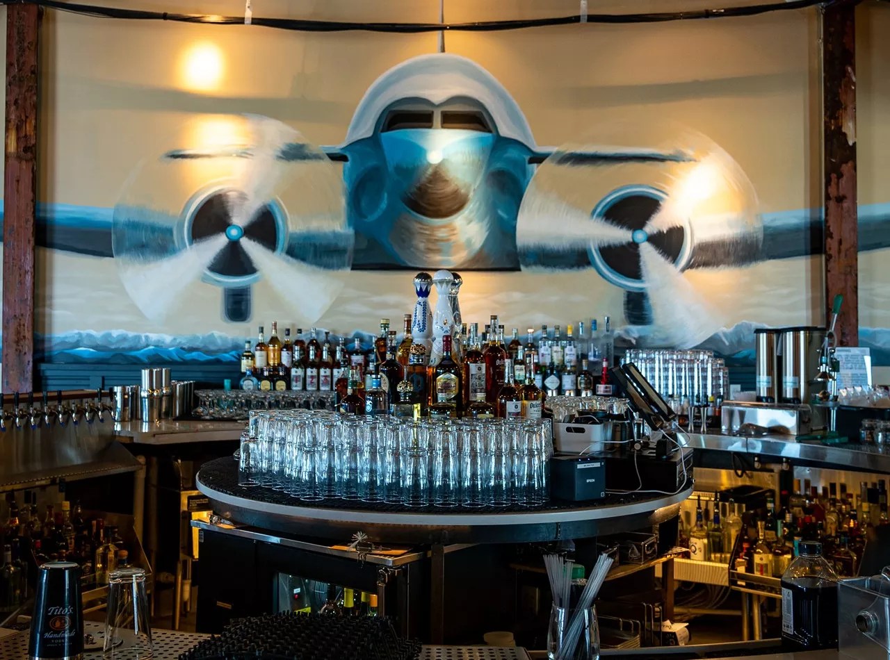 The upstairs bar carries the aviation theme with a mural of a DC-3 plane.