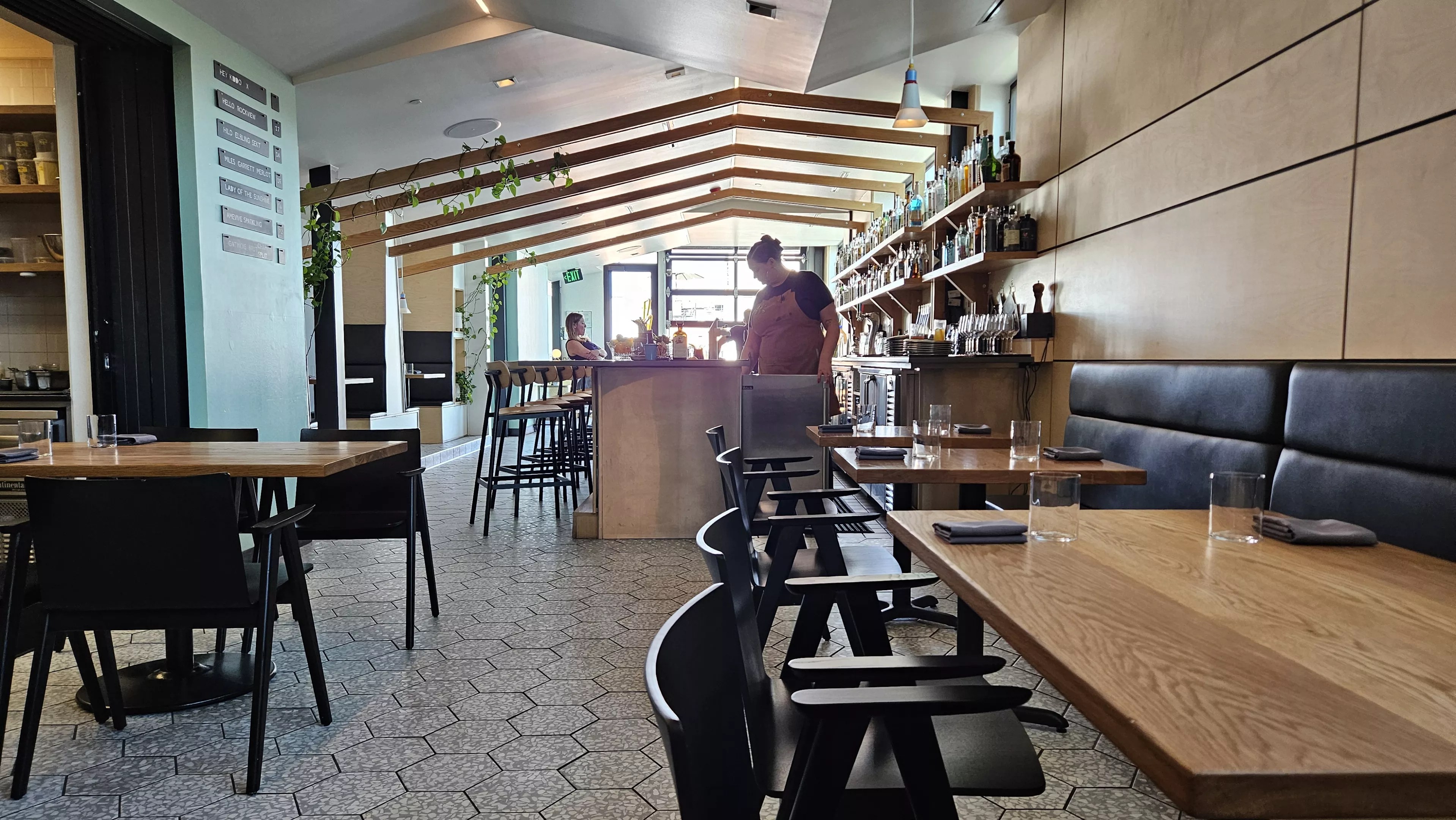 Hey Kiddo opened in 2023, and offers casual dining in a cool contemporary setting that reflects the hip modernity of its Berkeley neighborhood, but with an elevated twist. Unlike most of the businesses along the bustling Tennyson Street strip between 38th and 44th avenues, Hey Kiddo is on the third floor of the boutique Asher Hotel, with a view out the window to Tennyson as you exit the elevator (or stairs) to enter the dining room.