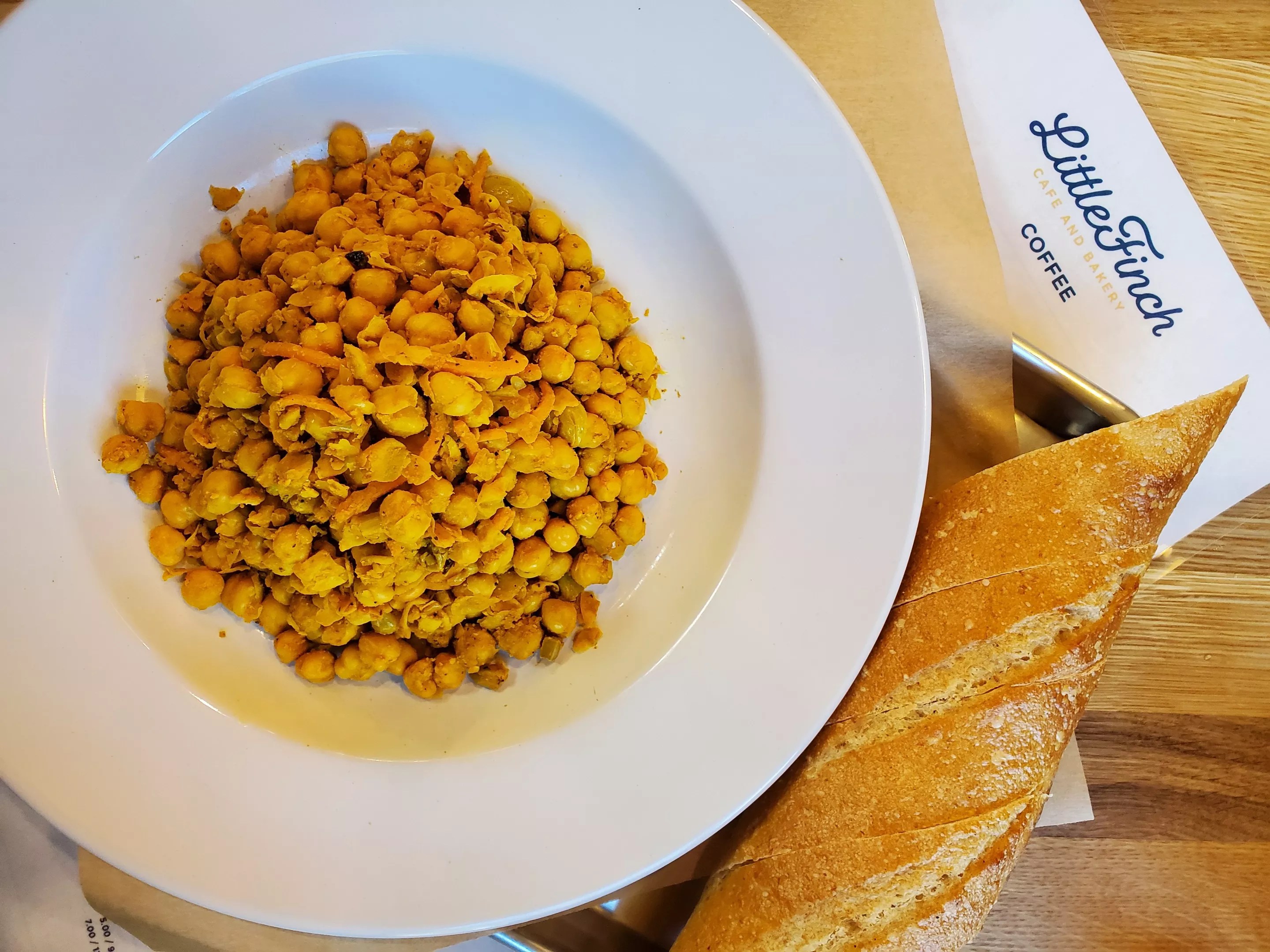 A hearty portion of curry chickpea salad comes with a baguette from City Bakery for .