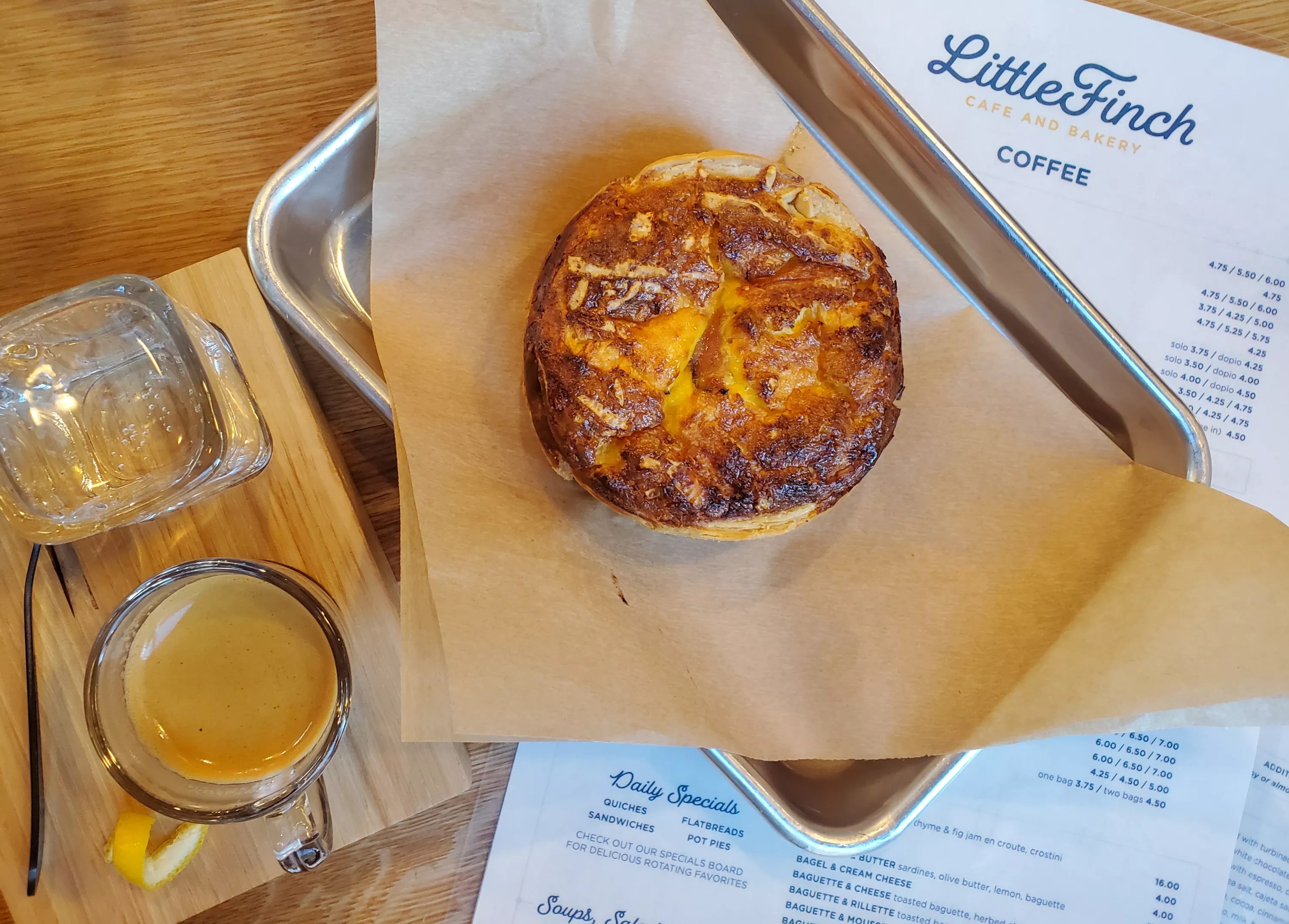 A personal-sized quiche Lorraine and espresso served with soda water to cleanse the palate.