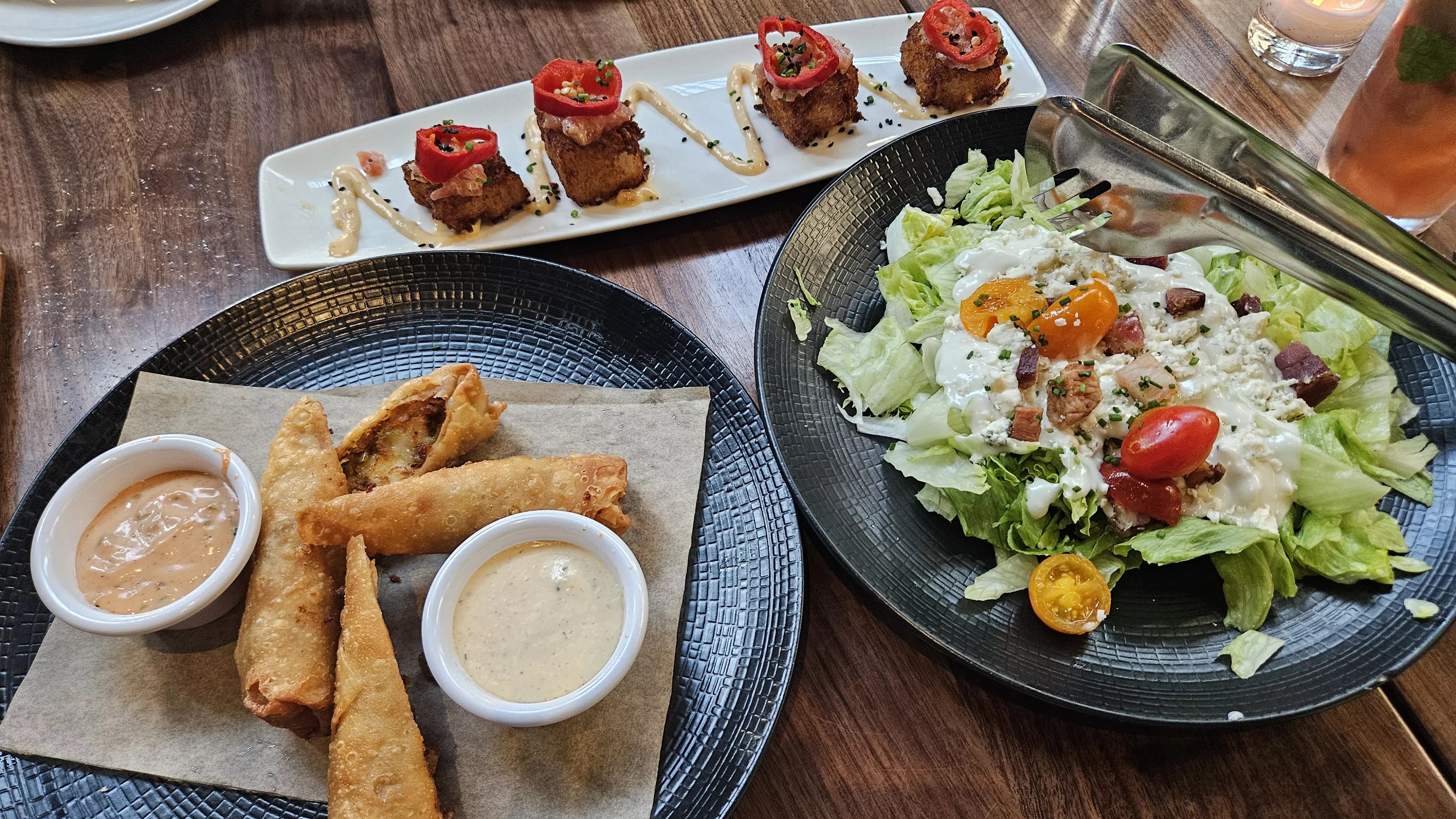Appetizers: cubes of spicy yellowtail crispy rice, cheeseteak eggrolls and blue cheese iceberg salad.