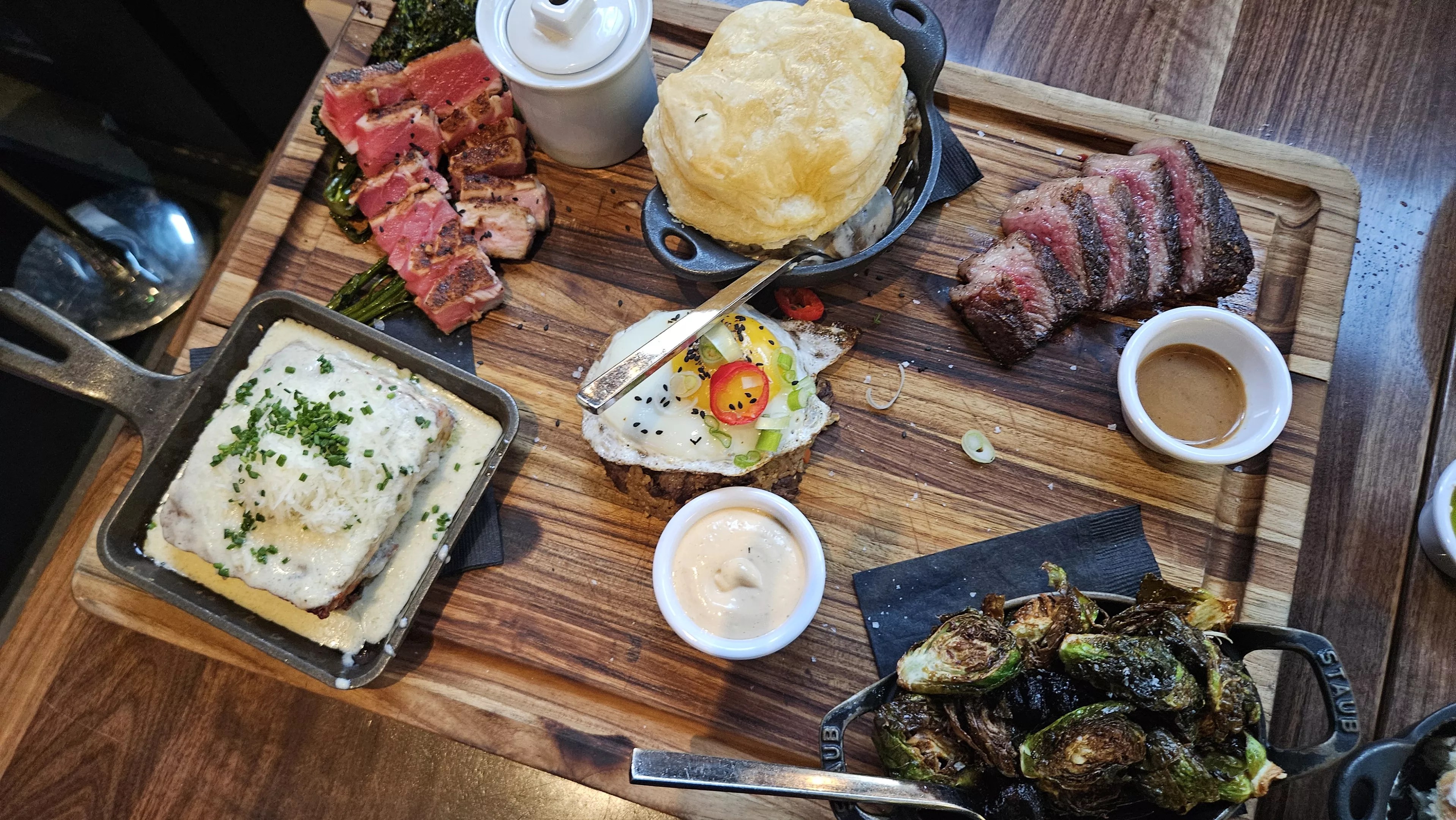Main course clockwise from top left: blackened ahi tuna on sesame broccoli with ginger miso brown butter, mushroom pot pie, A5 Wagyu Picanha Brazilian-style, Brussels sprouts, Wagyu fried rice and potato gratin.