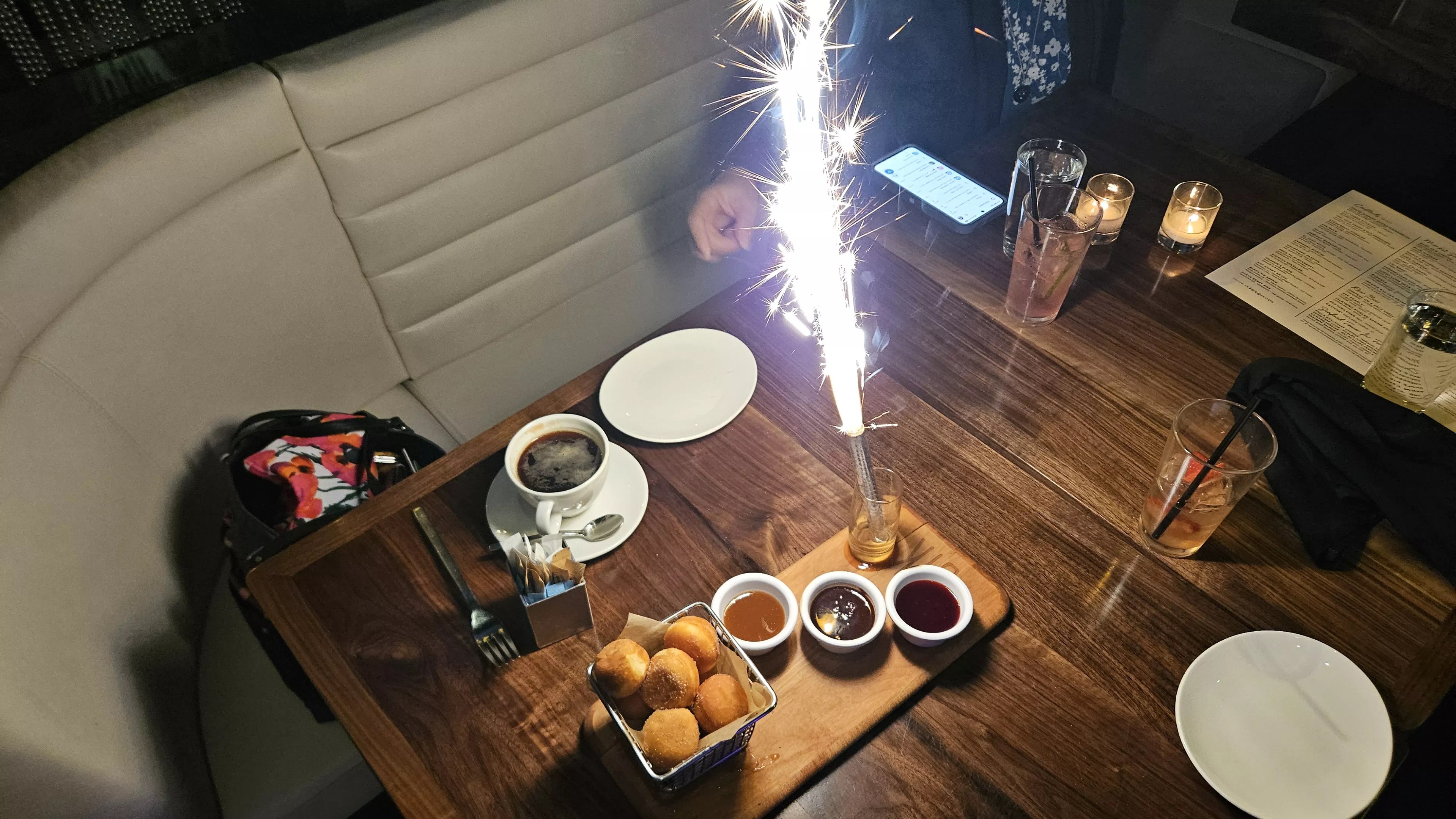 Anthony, our friendly and very knowledgeable server, brought out a dessert of housemade doughnut holes with three dipping sauces (caramel, chocolate and berry), accompanied by a sparkler firework that shot flames for a full minute or more. It was exciting, albeit a bit of overkill that had other diners staring at us as though it were one of our birthdays.
