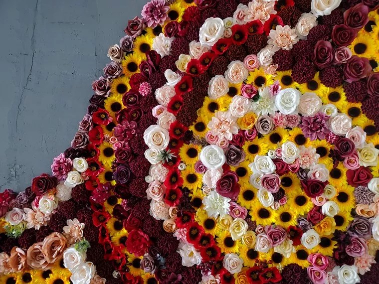 One of the design details at Molotov is a floral wall installation inspired by Ukrainian headdresses called vinoks.