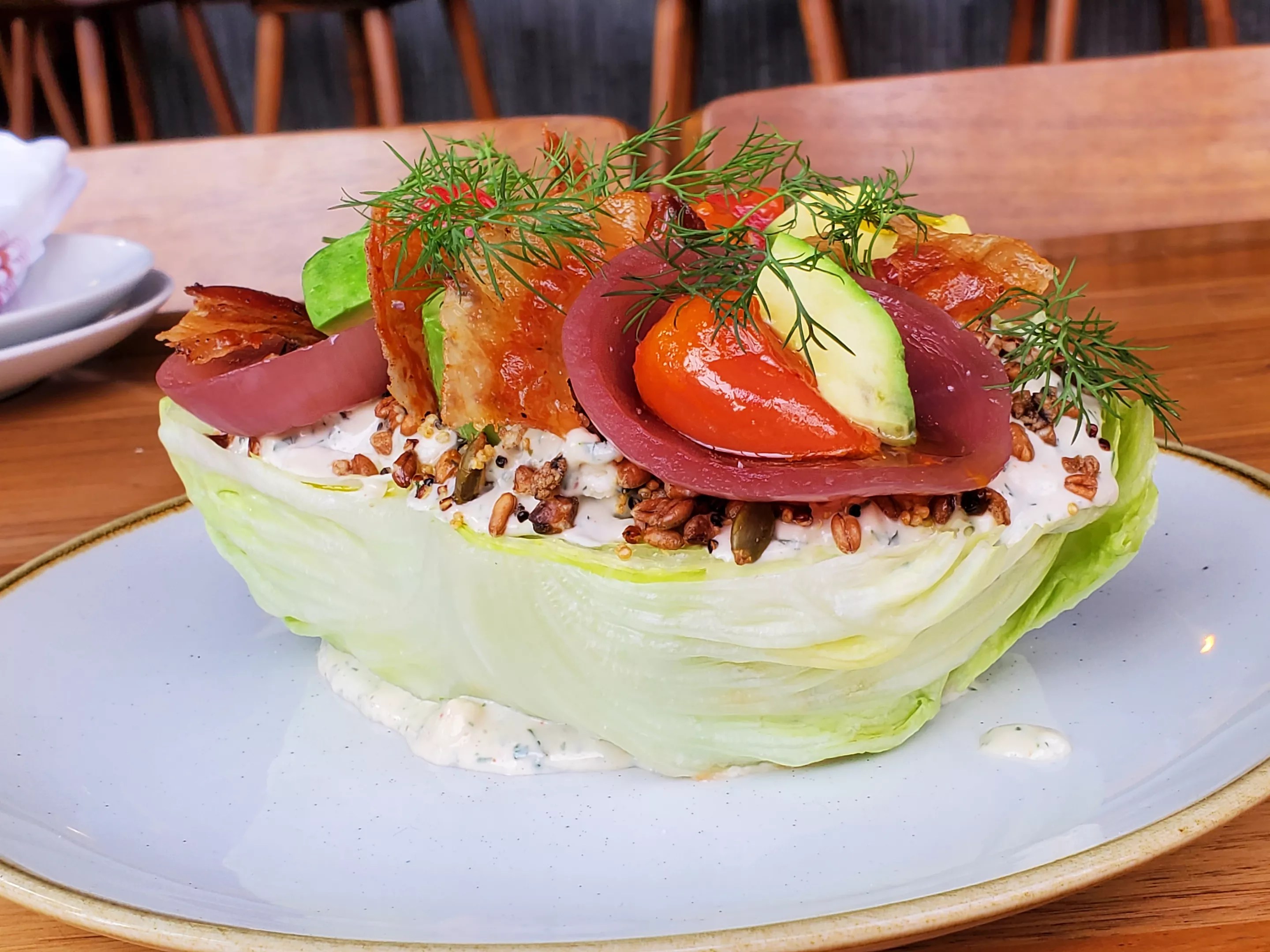 The wedge salad at A5 is topped with a crunch mixture of seeds and crispy guanciale.