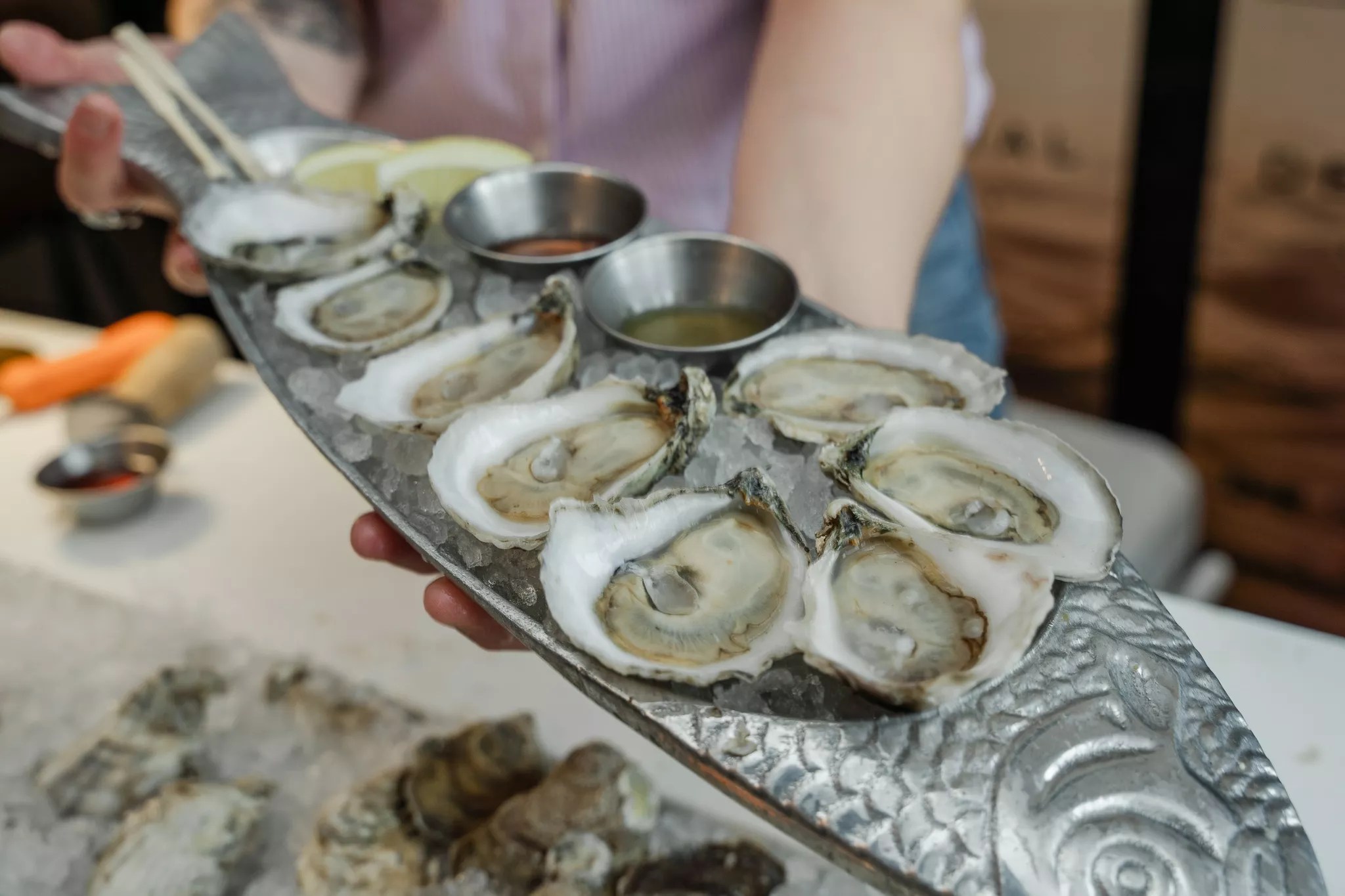 She takes pride in her oyster skills and even does extra arm workouts and uses a hand strengthener to keep in top shucking shape. “A lot of people don’t know what an oyster should look like,” she says. “Sometimes I see a tray of oysters at a restaurant and they’re blown to pieces – it looks like someone opened it with a shotgun. I have that high standard of how they should look – not ripped open, no shells in it. I’m a lot better than I used to be. I can keep up with the volume while maintaining quality.”