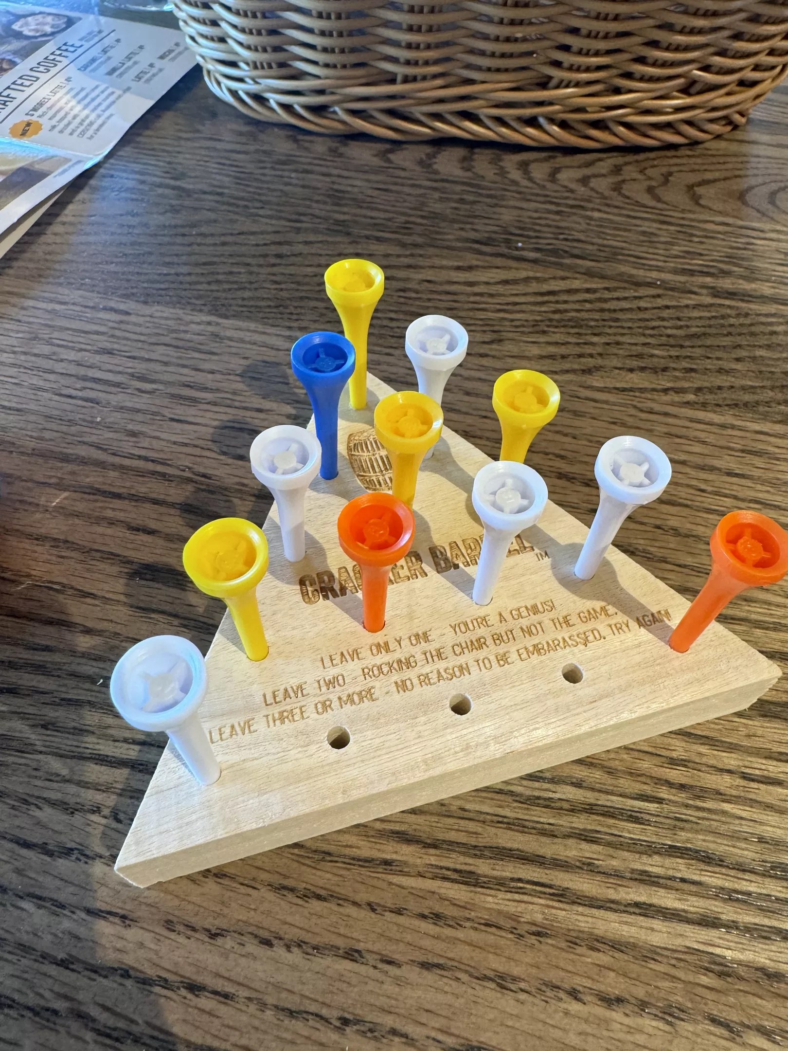 On a pre-opening visit, we noticed that the message on the front of the game, which sits at every table in every Cracker Barrel, has been made nicer. In the past, the game would tell people who left three or more pegs that they are “just plain dumb” and those who left four or more that they are “just plain eg-no-ra-moose” (a pronunciation of ignoramus, meaning a dumb or ignorant).