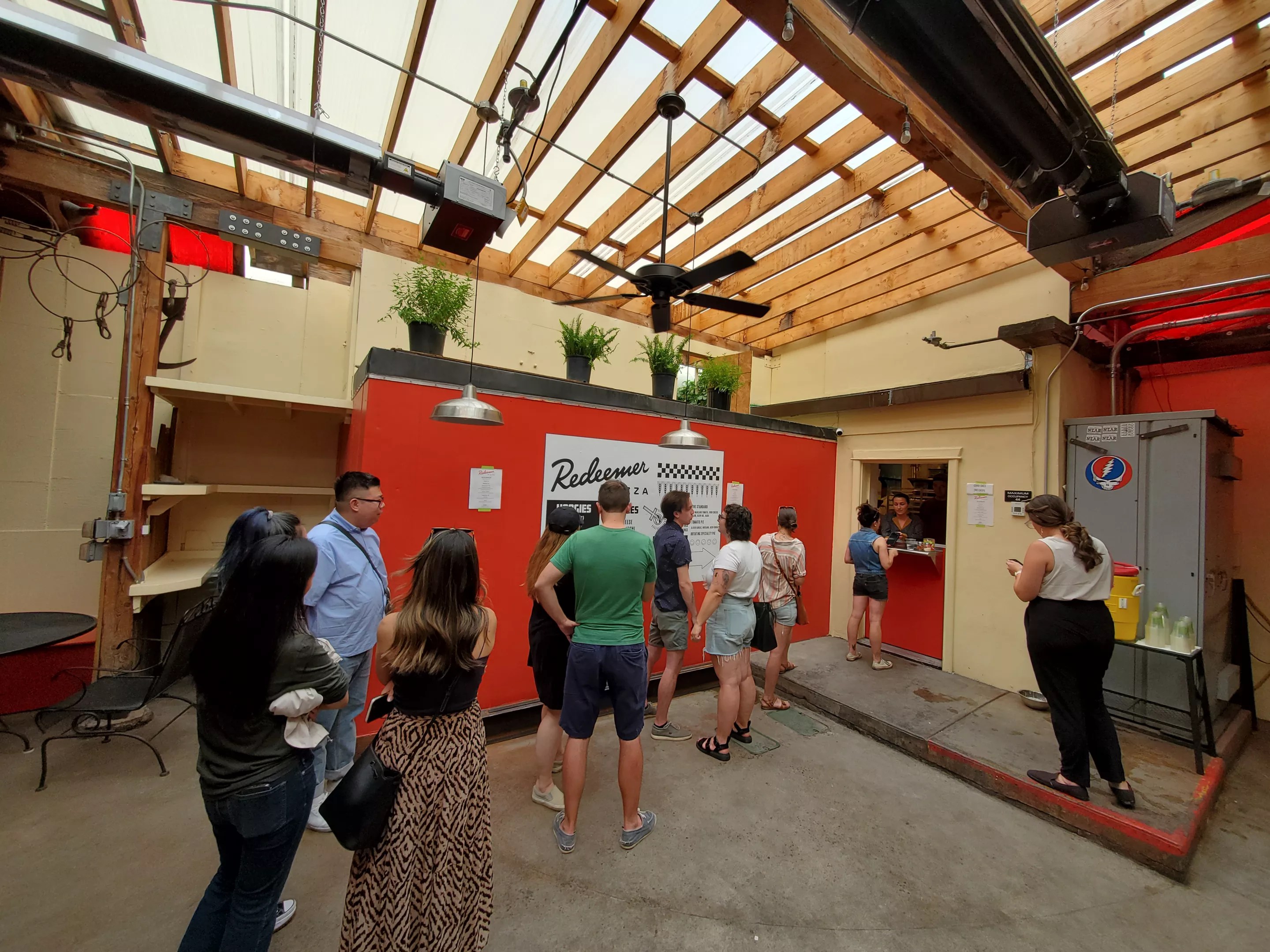 Redeemer Pizza officially opens today, July 28, and for now, ordering will be done the same way: You’ll head to the alley and look for the neon pizza slice sign marking the back entrance. The covered patio will be open; a dining room will come later. The space is sparsely decorated, with pops of red and a concrete floor.