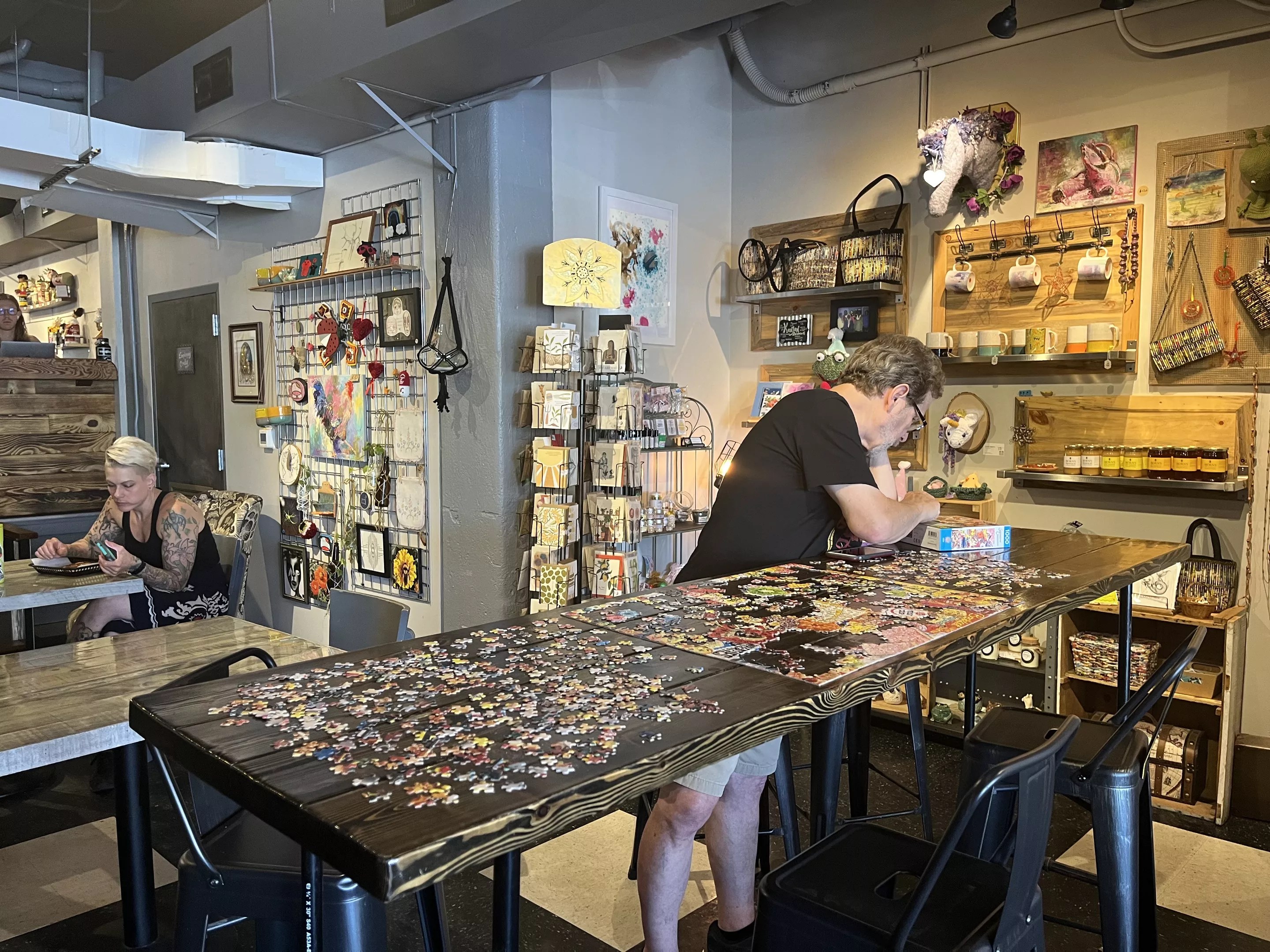 The gift and plant shop All Its Own shares the space, displaying charming little plants, gem collections, mugs, art and more in the back and along the walls. There is also local artwork displayed, including a small, phone booth-sized room that guests can peek into, offering a mini immersive art experience. There’s a selfie museum, too – a surprisingly charming space with displays to pose in, complete with light rings.