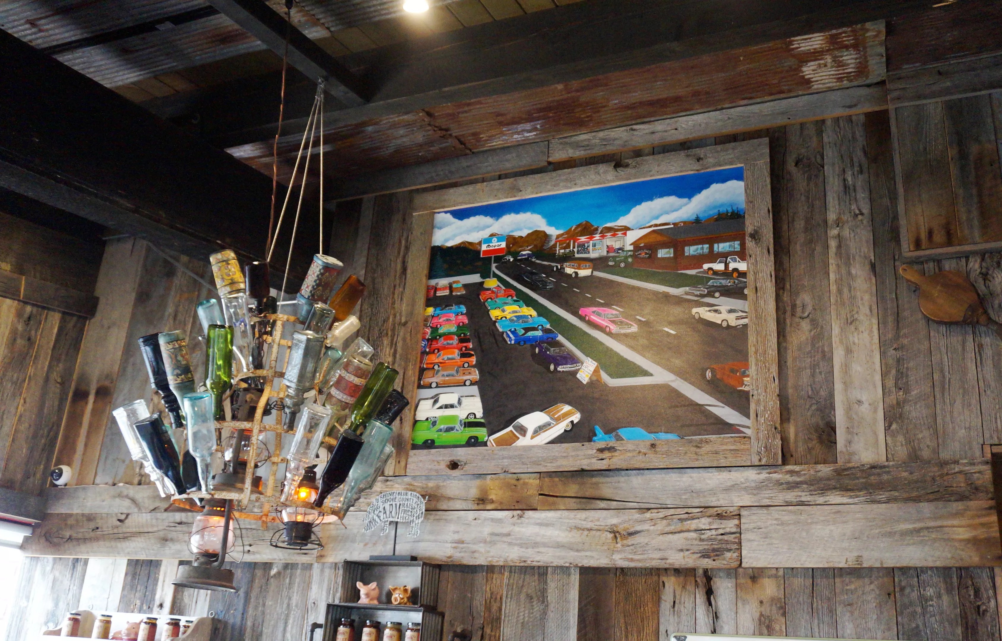 The new car-themed painting inspired by a mural found beneath paneleing in the back of the restaurant.