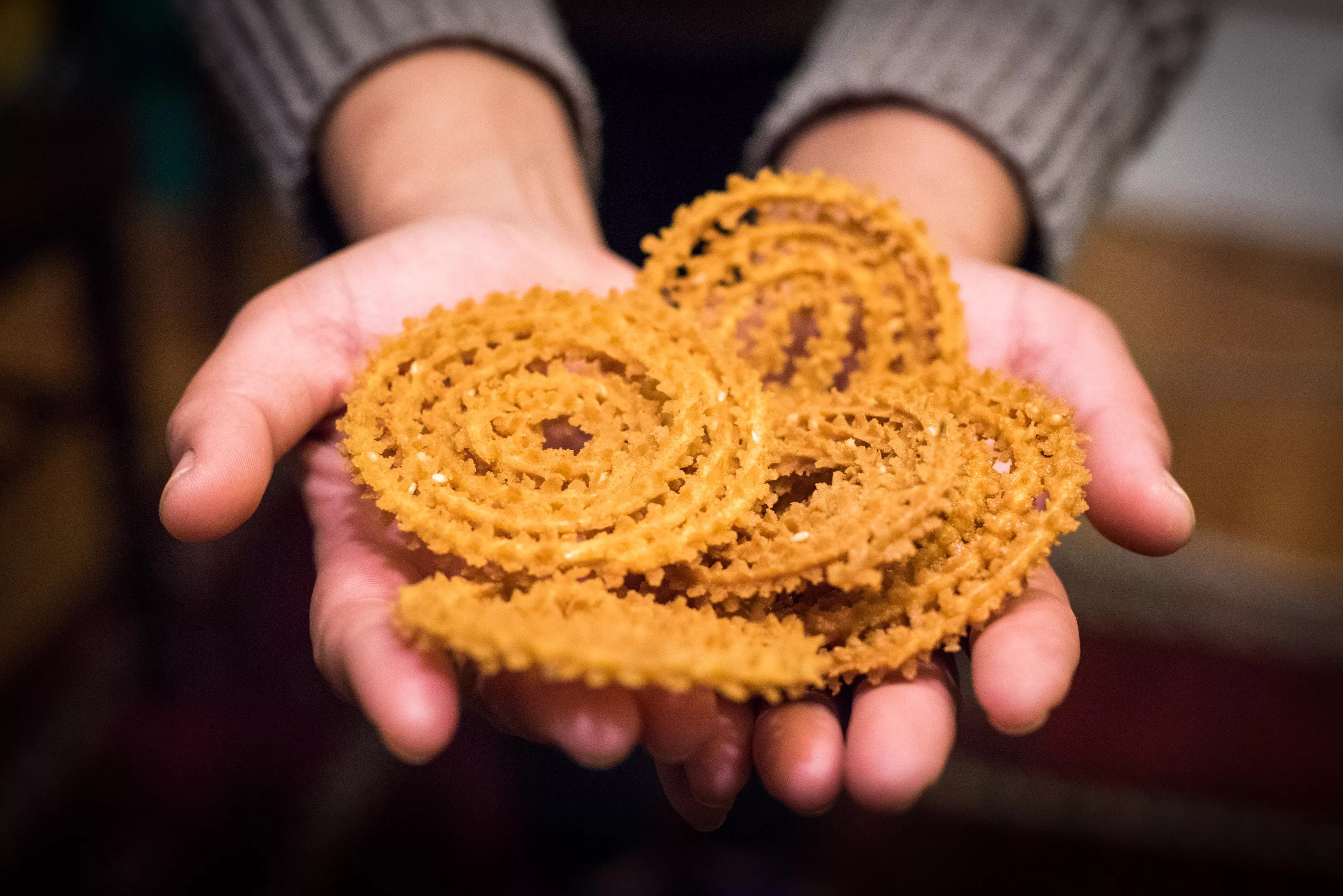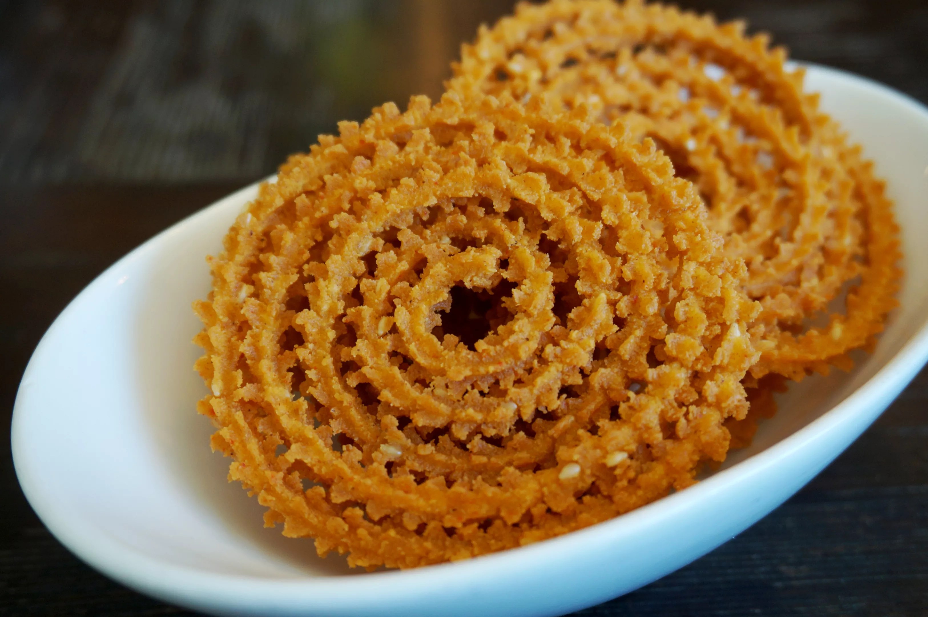 Murukku are crunchy, spiced snacks typical of South Indian street vendors.