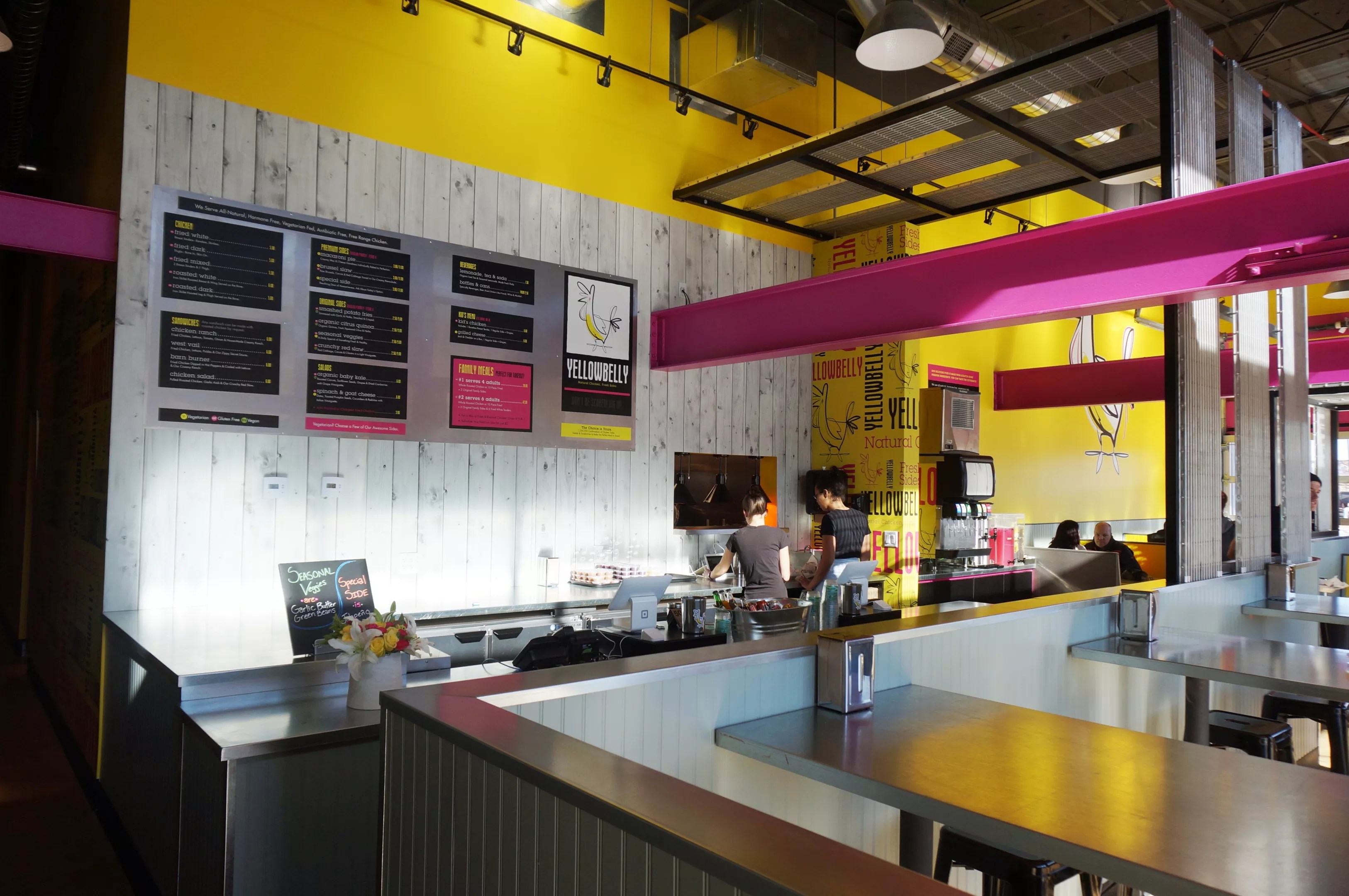 Like the other eateries in the marketplace, Yellowbelly is decked out in bold colors and wall murals.