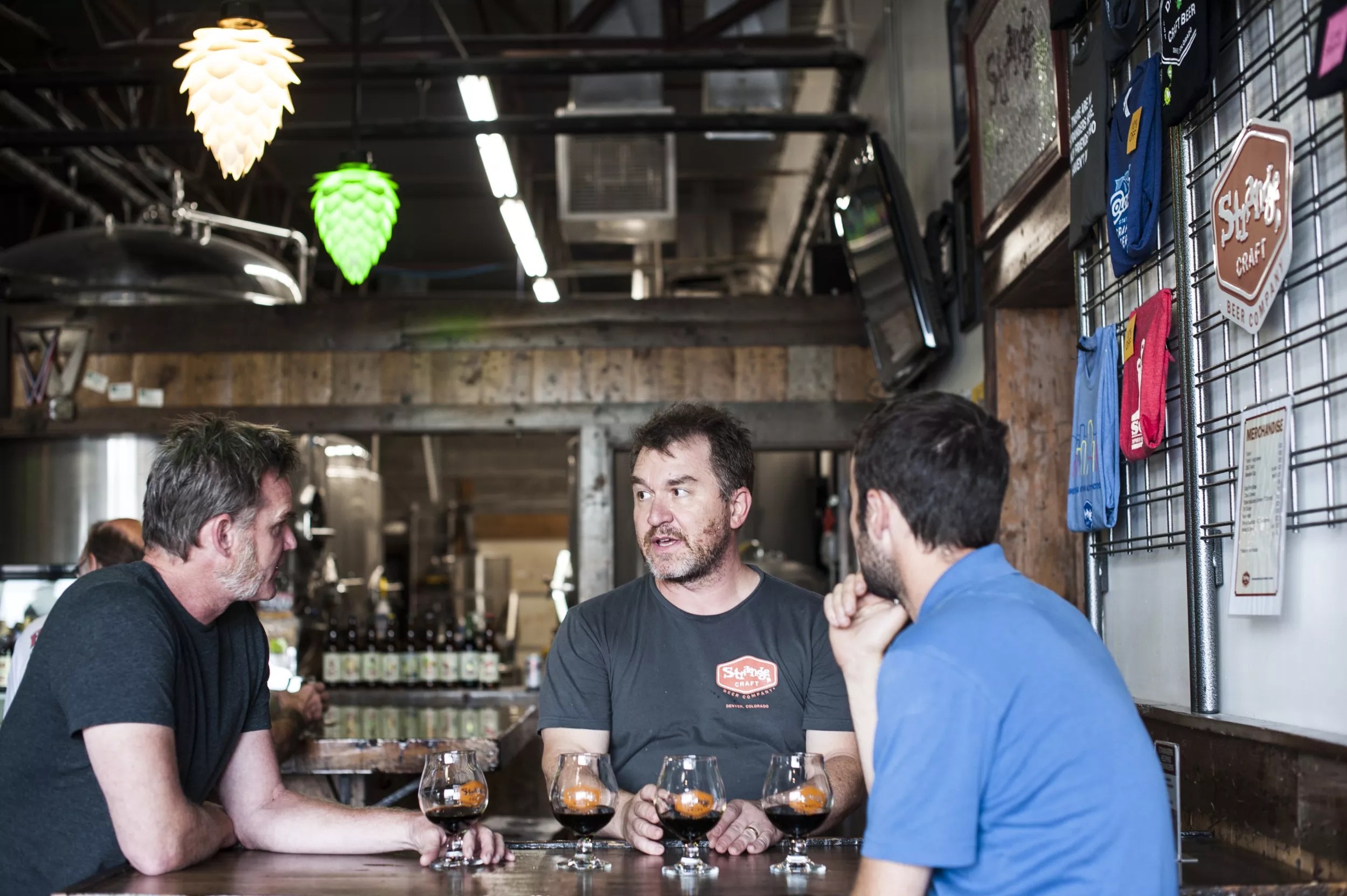 Stranahan’s head distiller Rob Dietrich (left), Strange Craft owner Tim Myers and Stranahan’s marketing manager Keegan Giannoni taste beer out of barrels.