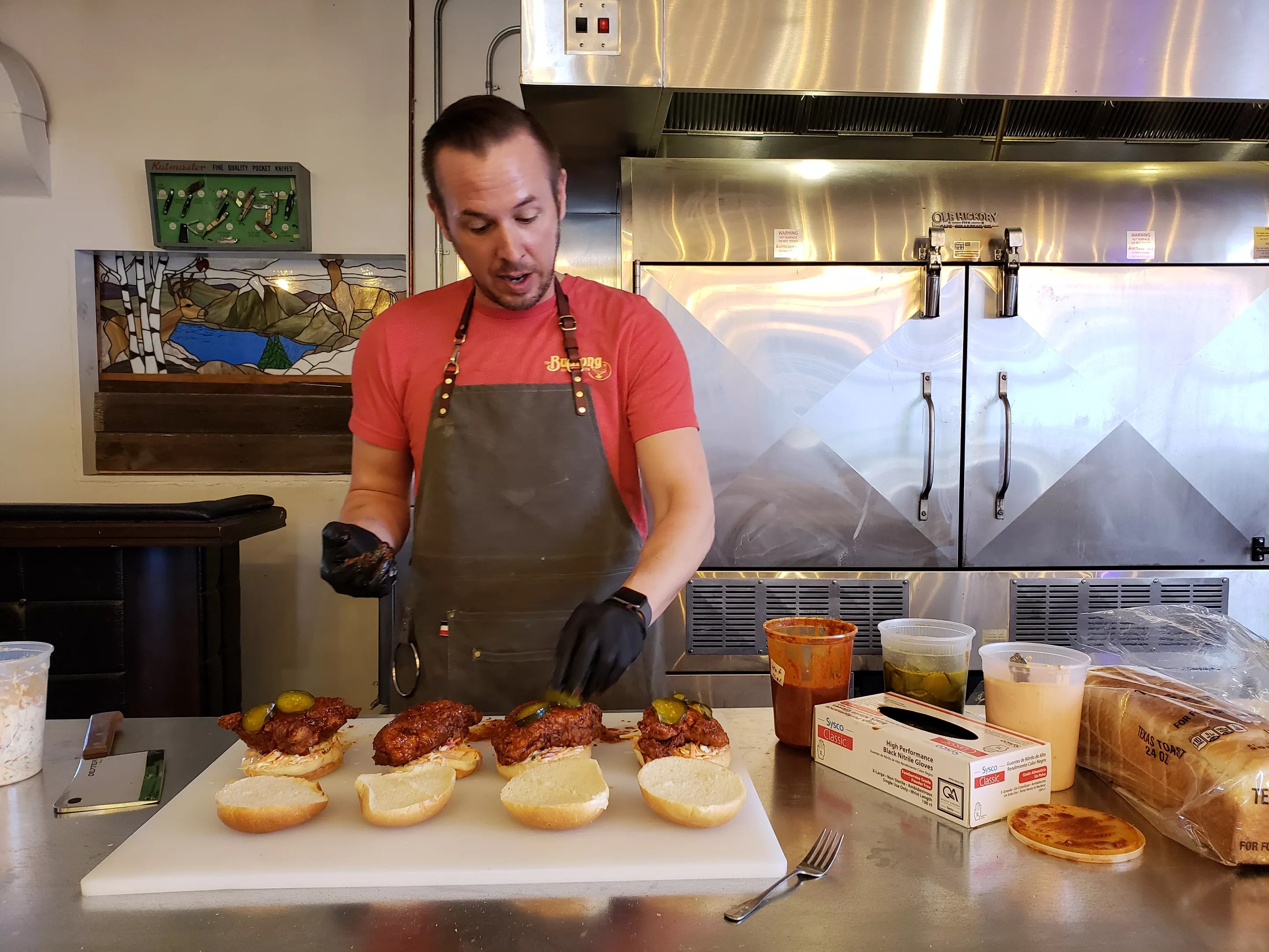 The Budlong Hot Chicken owner Jared Leonard making up hot chicken sandwiches.