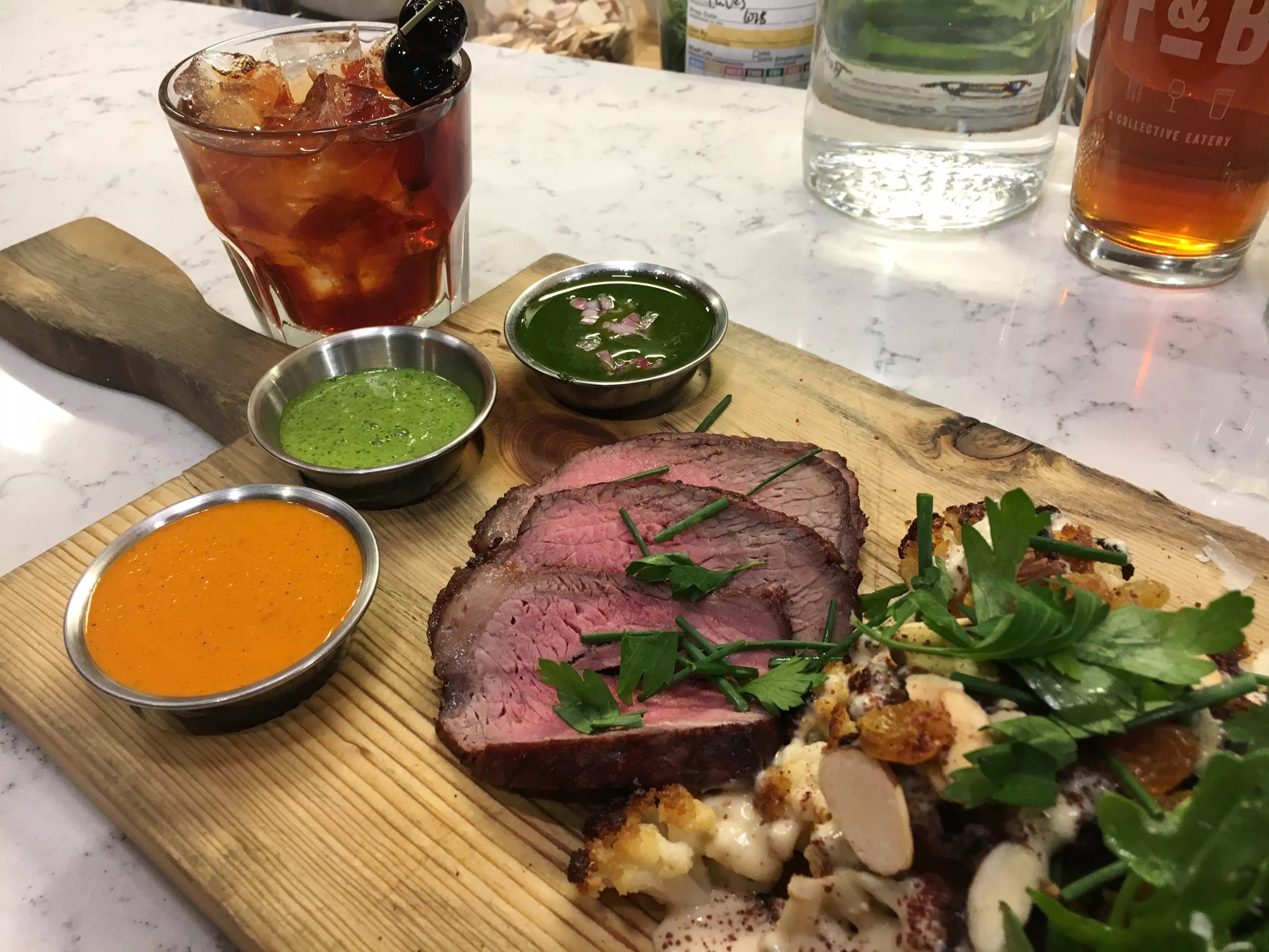 Wood-roasted beef sirloin with three sauces, charred cauliflower and a black Manhattan from the bar.