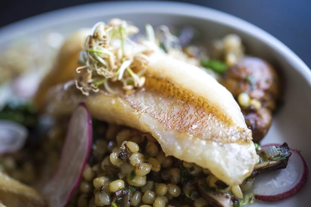 Okonomiyaki (cabbage pancakes) are crisscrossed with housemade Japanese mayo amped with dehydrated scallop powder, not MSG. Fish of the day – bycatch of the day, actually, so you can sleep easy knowing you’re doing your part to save the oceans – perches on a pile of lemony wheat berries as large as a sand dune.