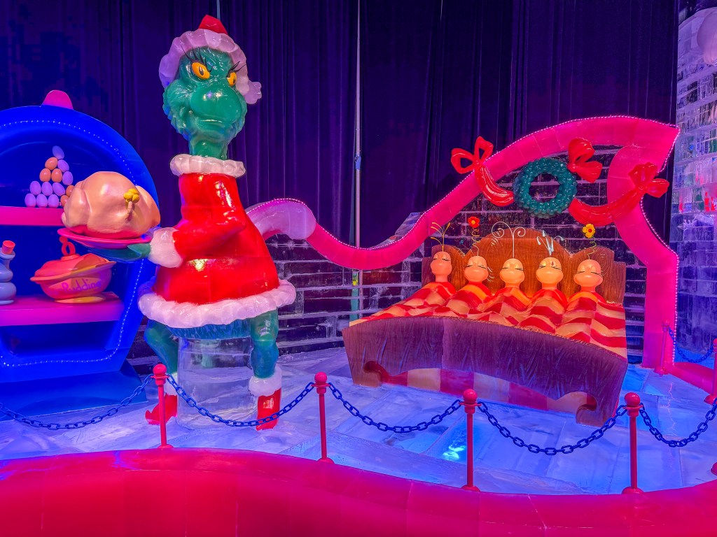 As you walk through the frozen display, you’ll see the Grinch and his dog, Max, getting their sleigh ready to head into Whoville; the Grinch inside a house as little ones sleep; and, in the final scene, the Grinch (his heart having grown) cutting the roast beast himself after returning all the presents and food to the Whos.