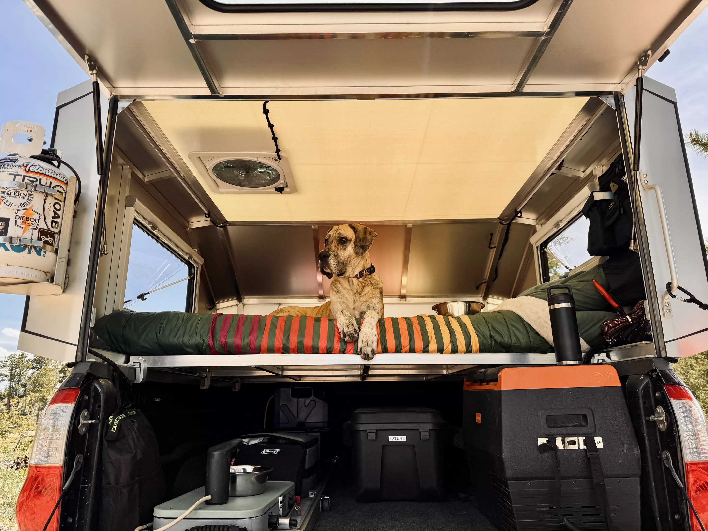 MoonLander is built to the exact truck model size and runs the entire length of the truck bed. It’s designed to be lightweight. The total weight will depend on your option configuration. As one of the lightest truck-bed campers on the market, MoonLander drives like a topper, not a camper. The two lofted bed panels are removable, making room to haul gear and supplies. The design is also aerodynamic, minimally impacting highway gas mileage.